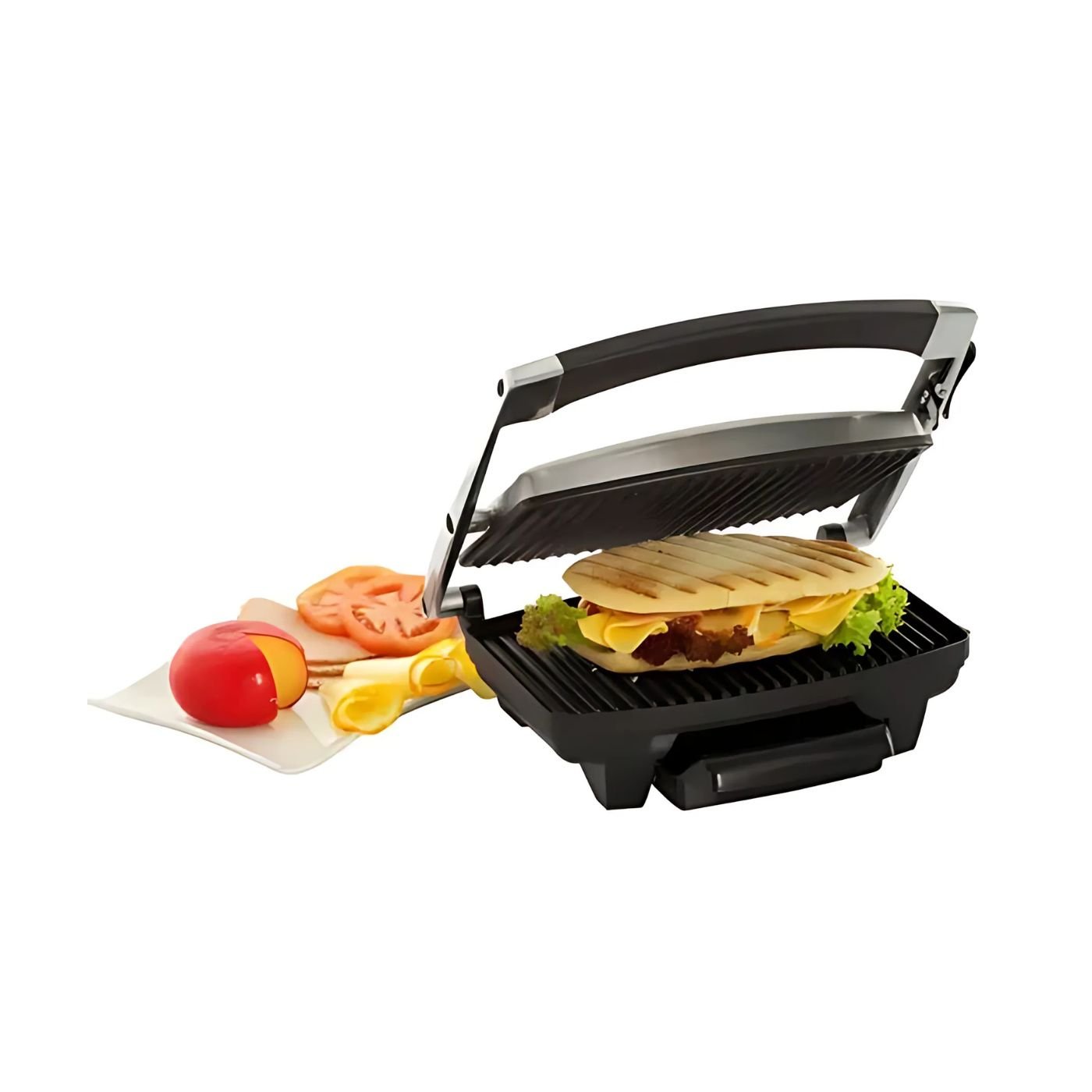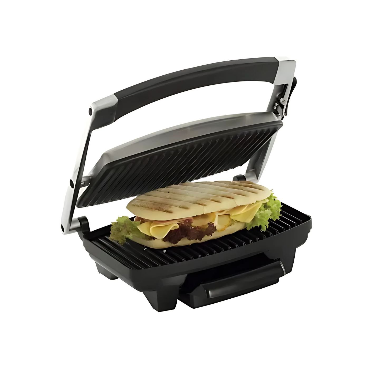 Cuenta también con indicadores luminosos: luz roja indica que el asador está en proceso de cocción y la luz verde se enciende cuando este finaliza, y sistema flotante de bisagras que permite ajustar según el tamaño del alimento.