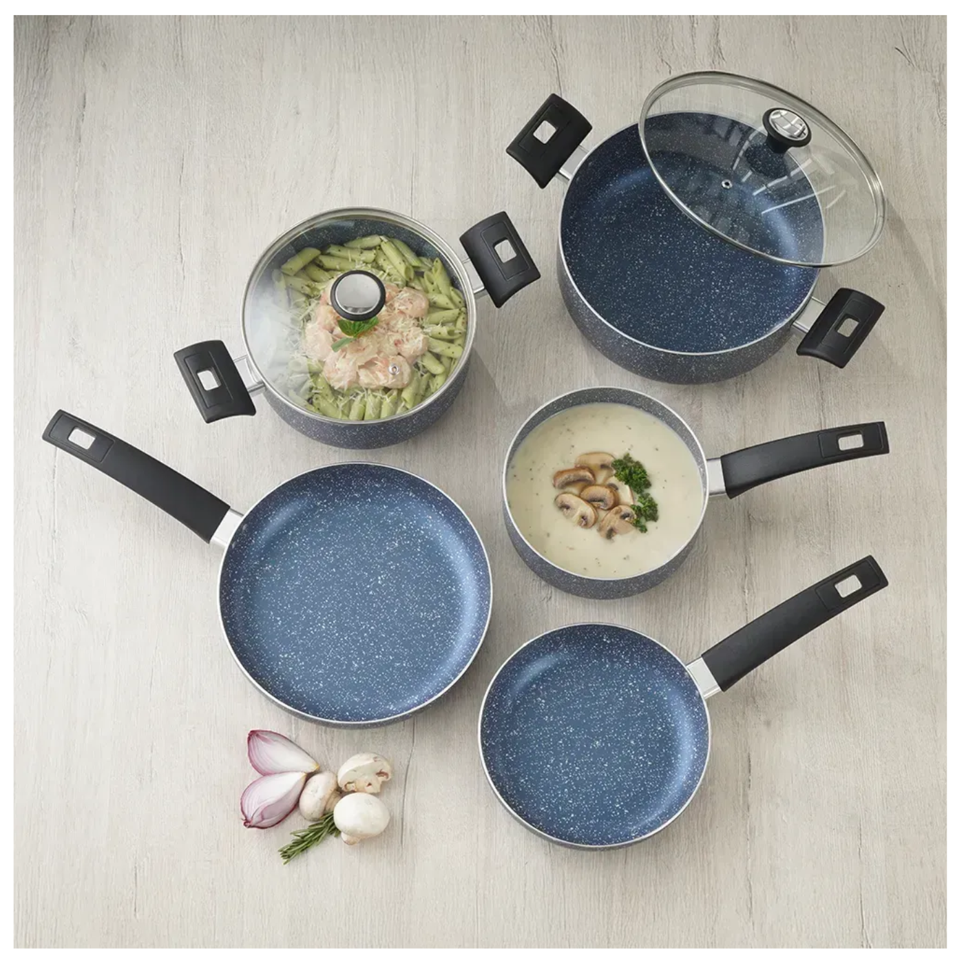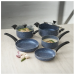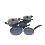 Cada pieza de esta batería está fabricada en aluminio de alta pureza y recubierta con 4 capas de antiadherente de origen italiano, lo que asegura una cocción uniforme, sin que los alimentos se adhieran. Además, sus mangos en baquelita aportan seguridad, resistencia al calor y una experiencia ergonómica al cocinar.