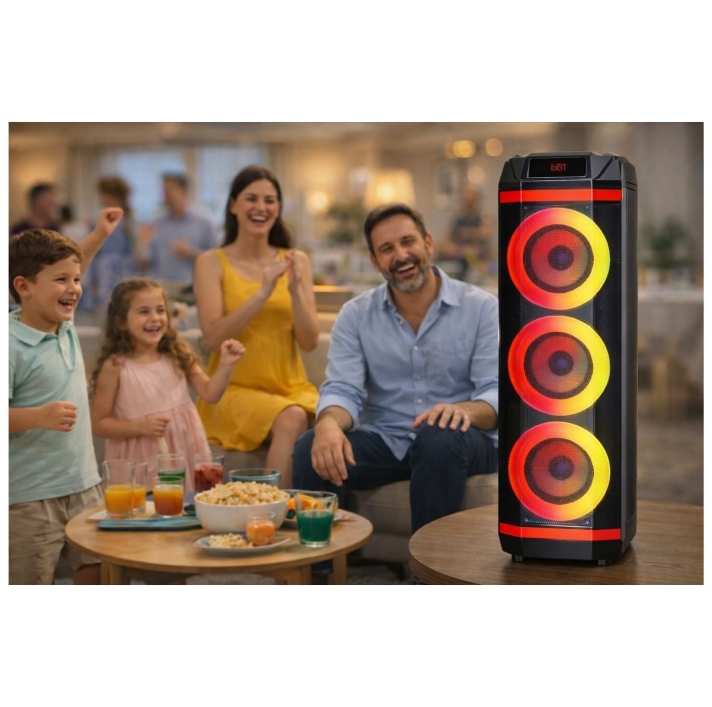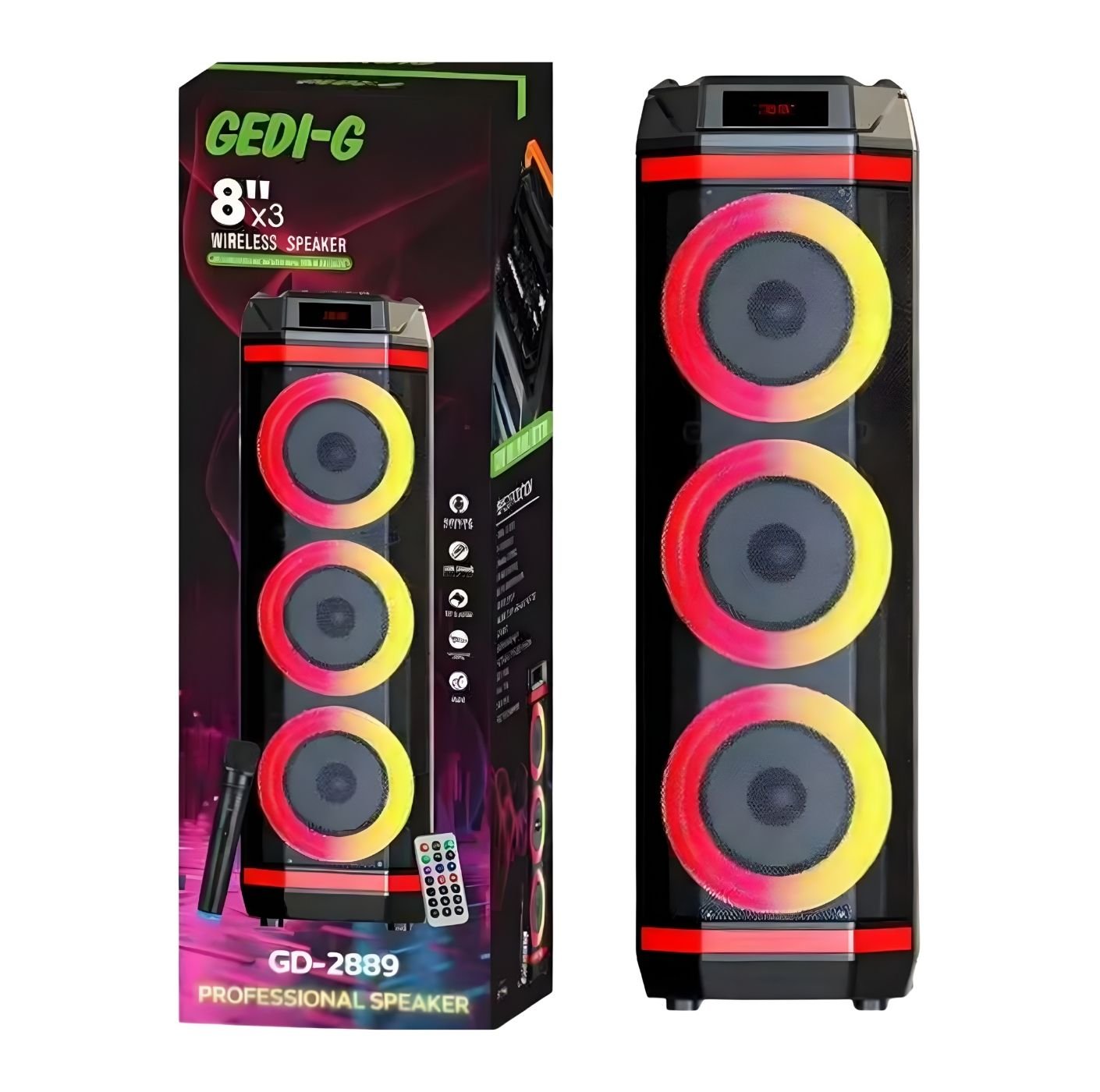 La Cabina de Sonido GEDI-G GD-2889 está diseñada para quienes buscan un equipo potente, portátil y versátil para disfrutar la música en cualquier momento. Su sistema de tres parlantes de 8 pulgadas ofrece un sonido claro y envolvente, ideal para fiestas, reuniones familiares y eventos sociales, garantizando una experiencia auditiva de alto nivel.