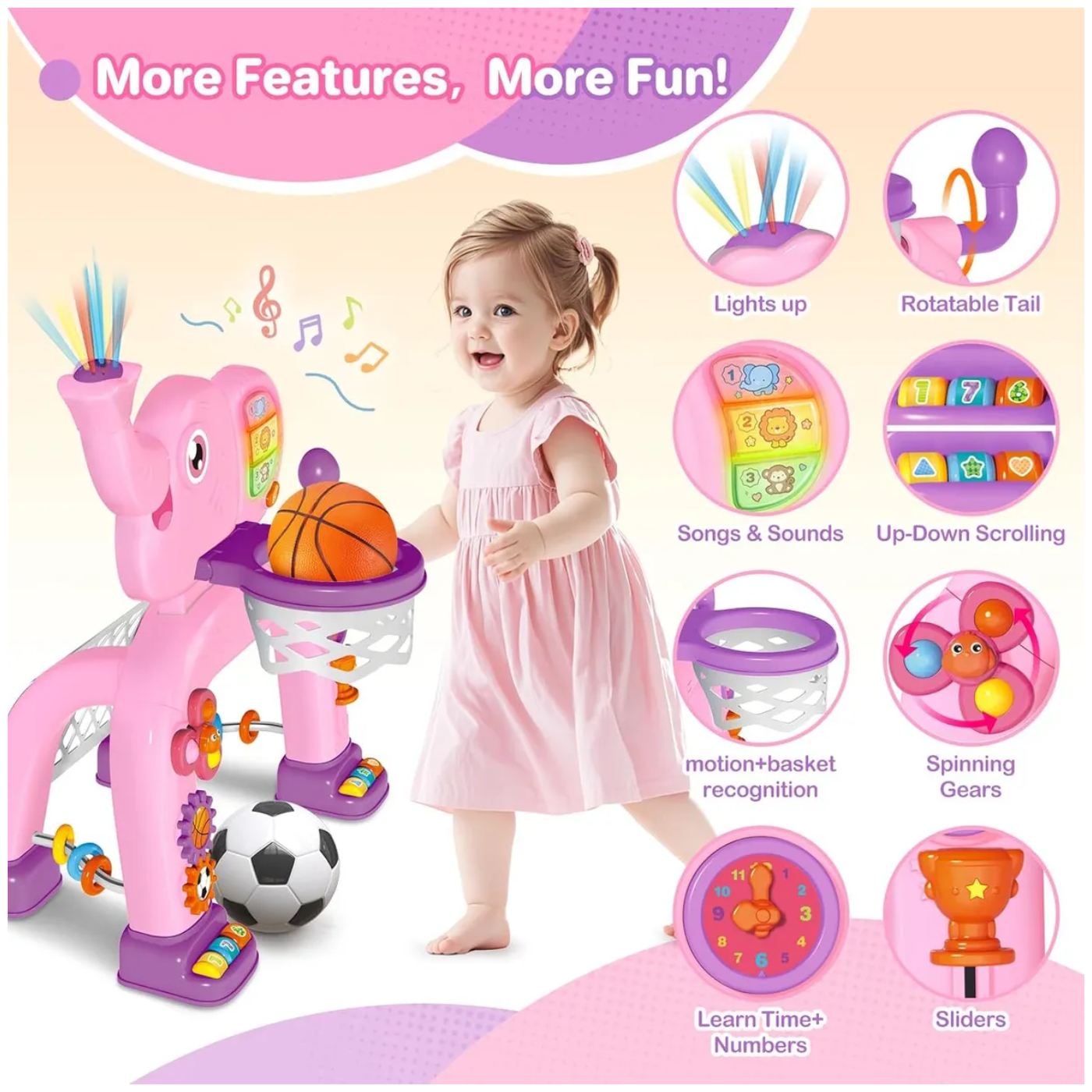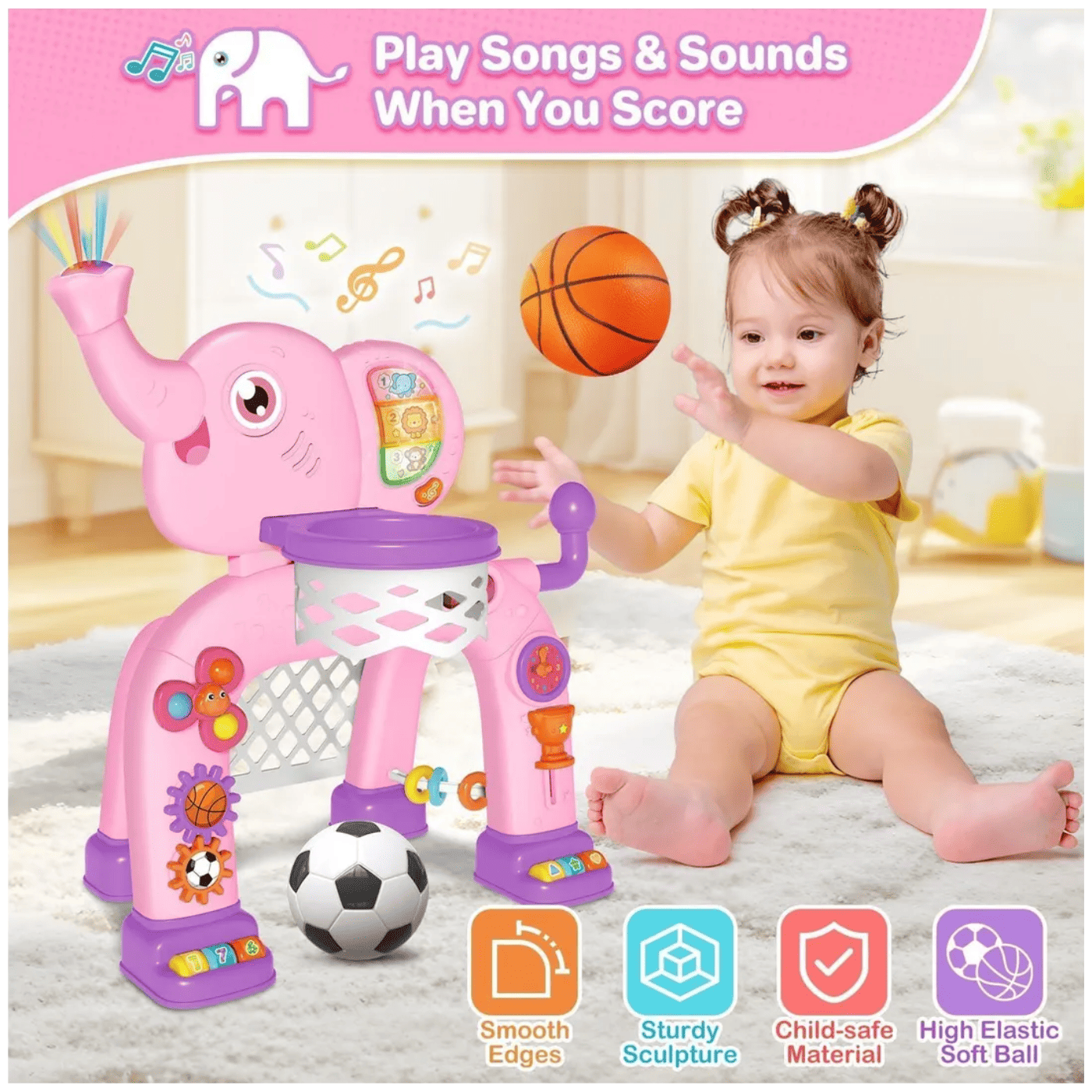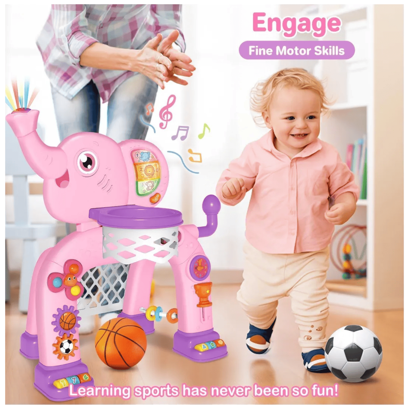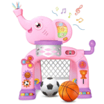 La Canasta Elefante 2 en 1 es el juguete perfecto para incentivar la actividad física y el desarrollo motriz de los más pequeños. Su divertido diseño con forma de elefante combina una canasta de baloncesto y una portería de fútbol, permitiendo a los niños disfrutar de diferentes juegos en un solo producto. Además, sus colores llamativos y detalles encantadores estimulan la creatividad, coordinación y equilibrio durante el juego.
