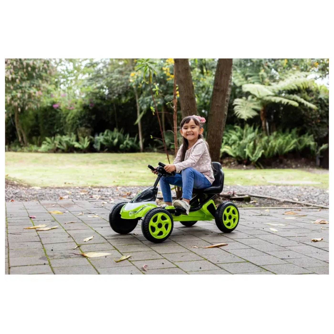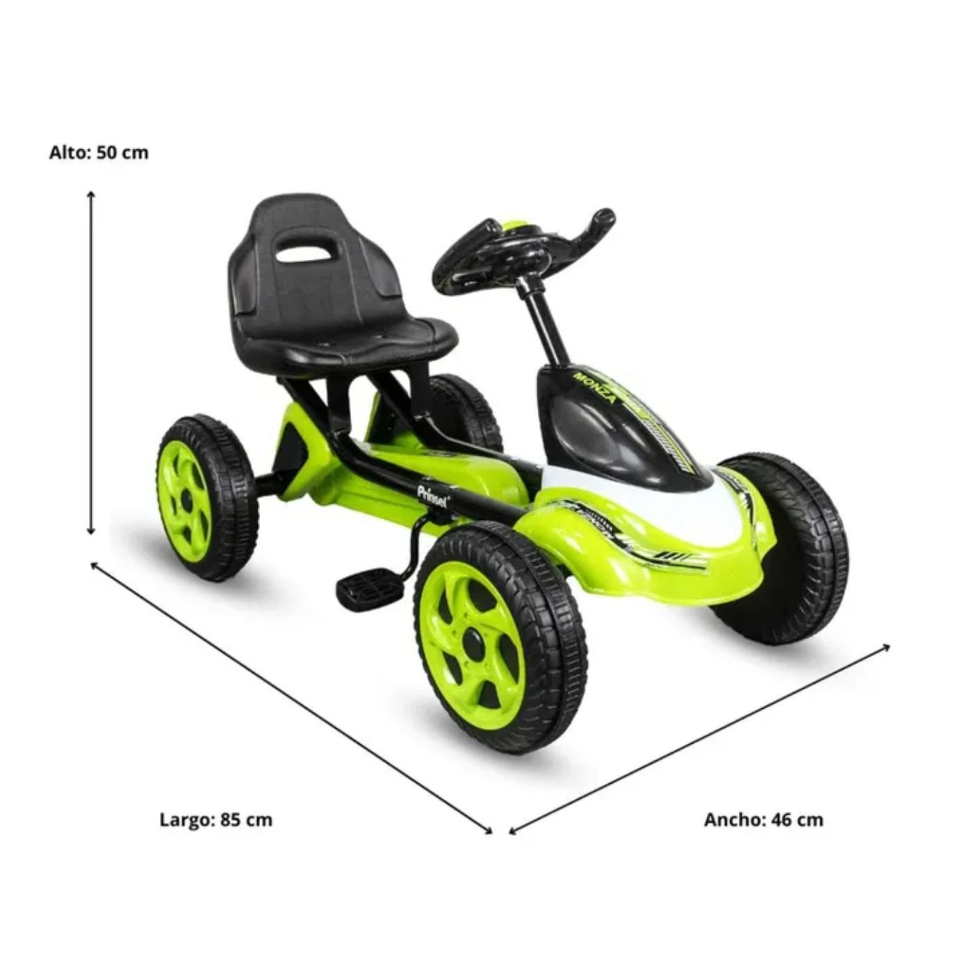 El Go Kart Monza Green Prinsel ofrece una conducción 100% a pedales que impulsa la actividad física, la coordinación y la diversión segura para niños desde los 3 años. Su estructura resistente, asiento ajustable y ruedas de alto agarre garantizan estabilidad y comodidad en cada recorrido.