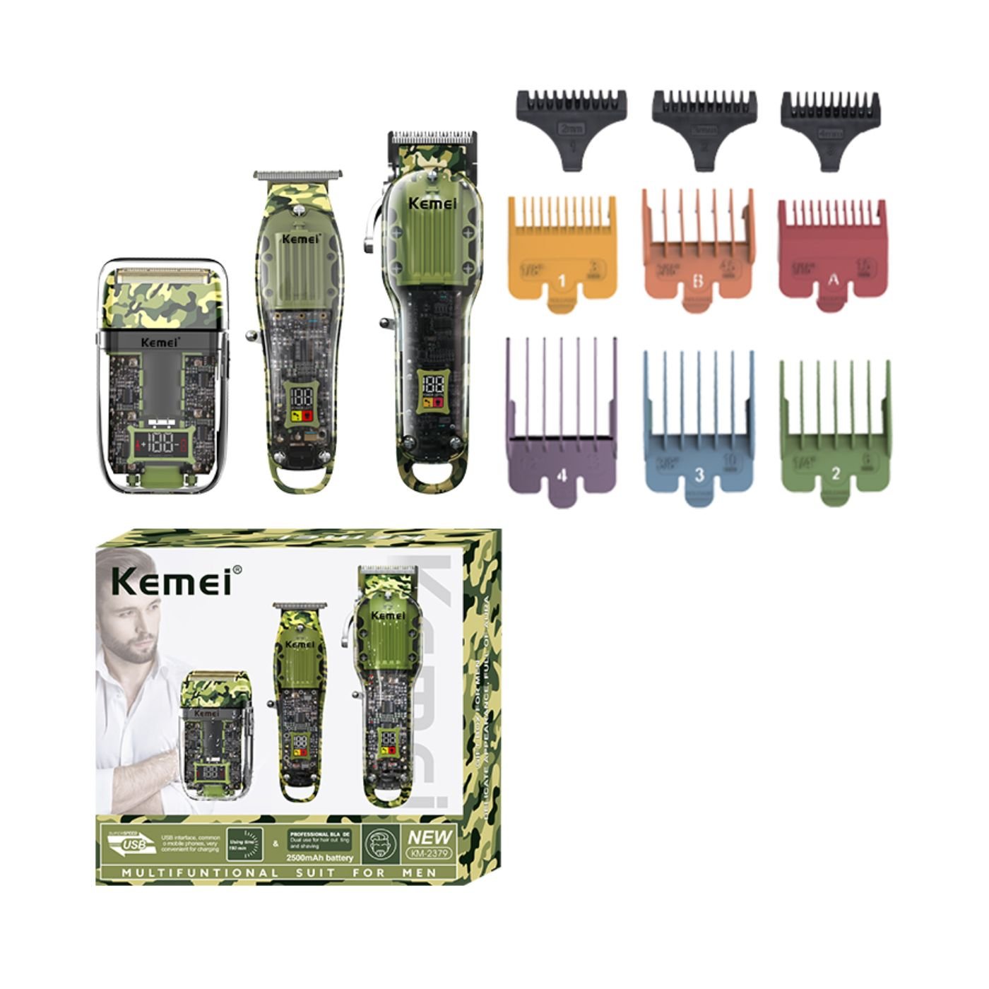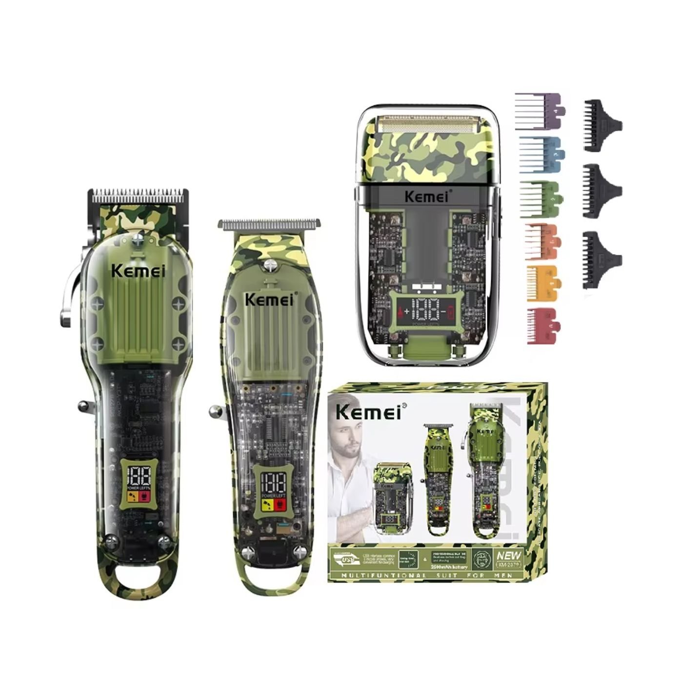 El Kemei KM-2379 es un set profesional 3 en 1 con diseño transparente acrílico que combina potencia, precisión y estilo. Incluye tres cortadoras (compacta, intermedia y profesional) con cuchillas de acero inoxidable, baterías de litio de larga duración y pantalla LCD, ideales para cortes, delineados y acabados de alto nivel.