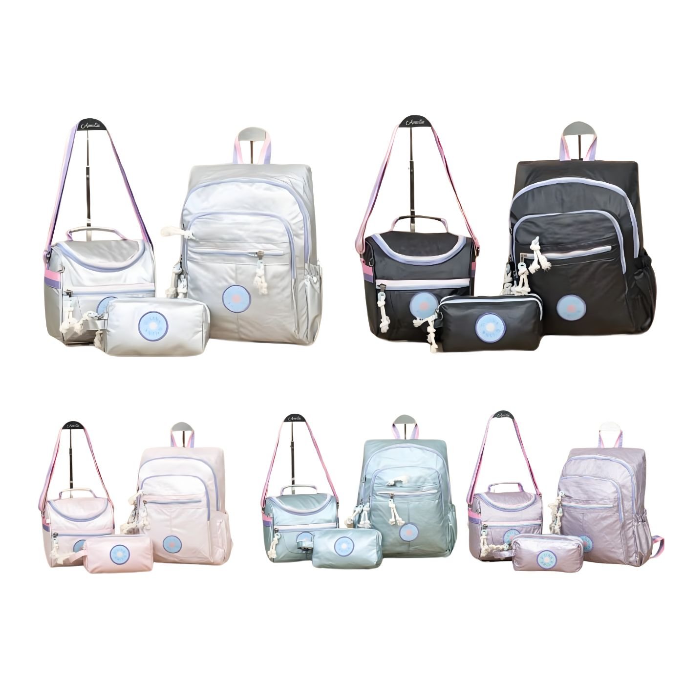 Este set está disponible en varios colores (lila, negro, plata, verde y rosa), permitiendo elegir el estilo que más se adapte al gusto personal. Cada pieza cuenta con un tamaño bien distribuido que facilita la organización: el morral ofrece el espacio ideal para cuadernos y libros, la lonchera es perfecta para transportar alimentos y la cartuchera permite guardar lápices y accesorios pequeños de manera ordenada.