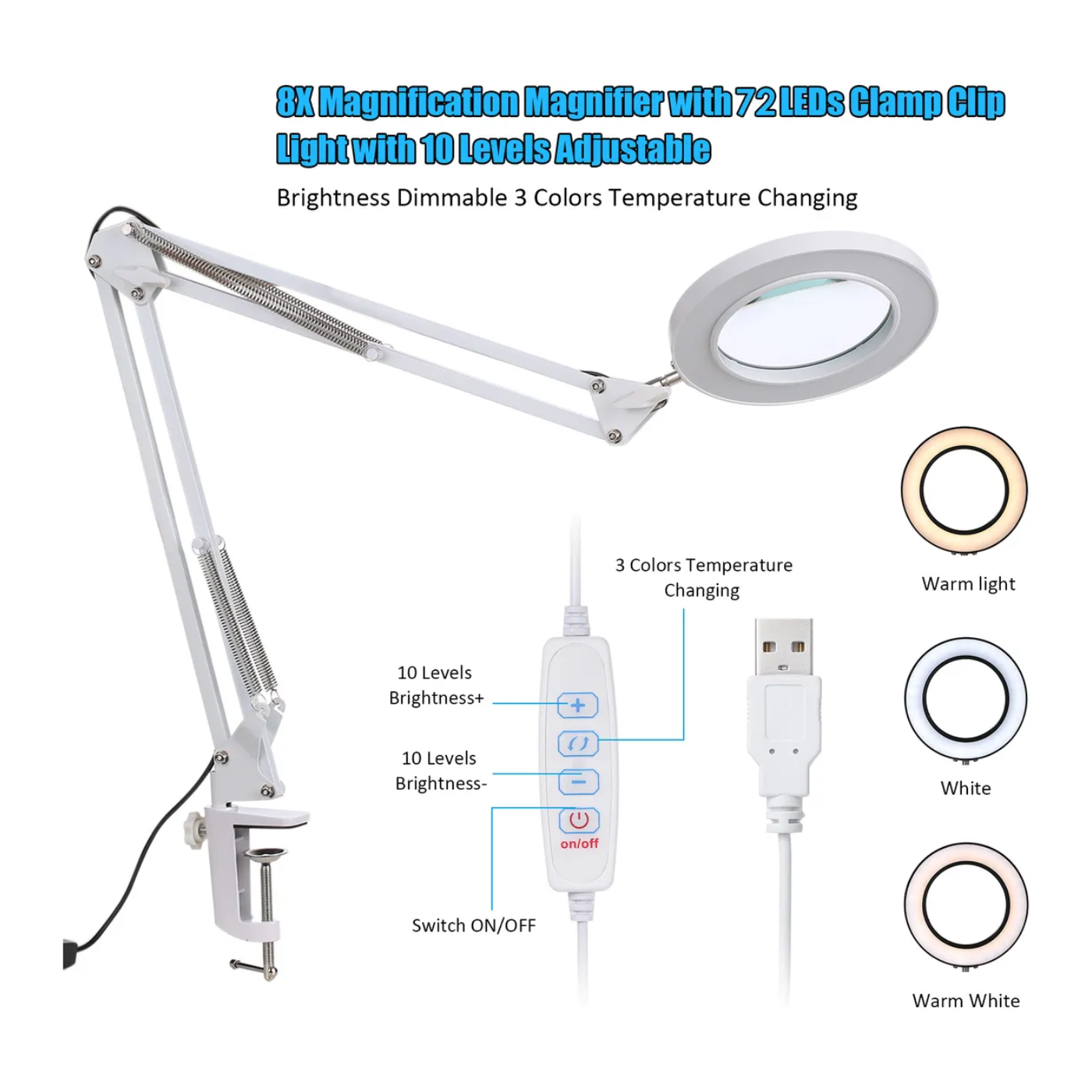 Equipada con 72 luces LED de alta luminosidad sin parpadeo, ofrece 10 niveles de brillo ajustable y 3 tonos de luz (fría, cálida y neutra) que se adaptan a diferentes ambientes y necesidades. Además, su lente de aumento de 8x permite una visualización clara y precisa de los detalles más pequeños.