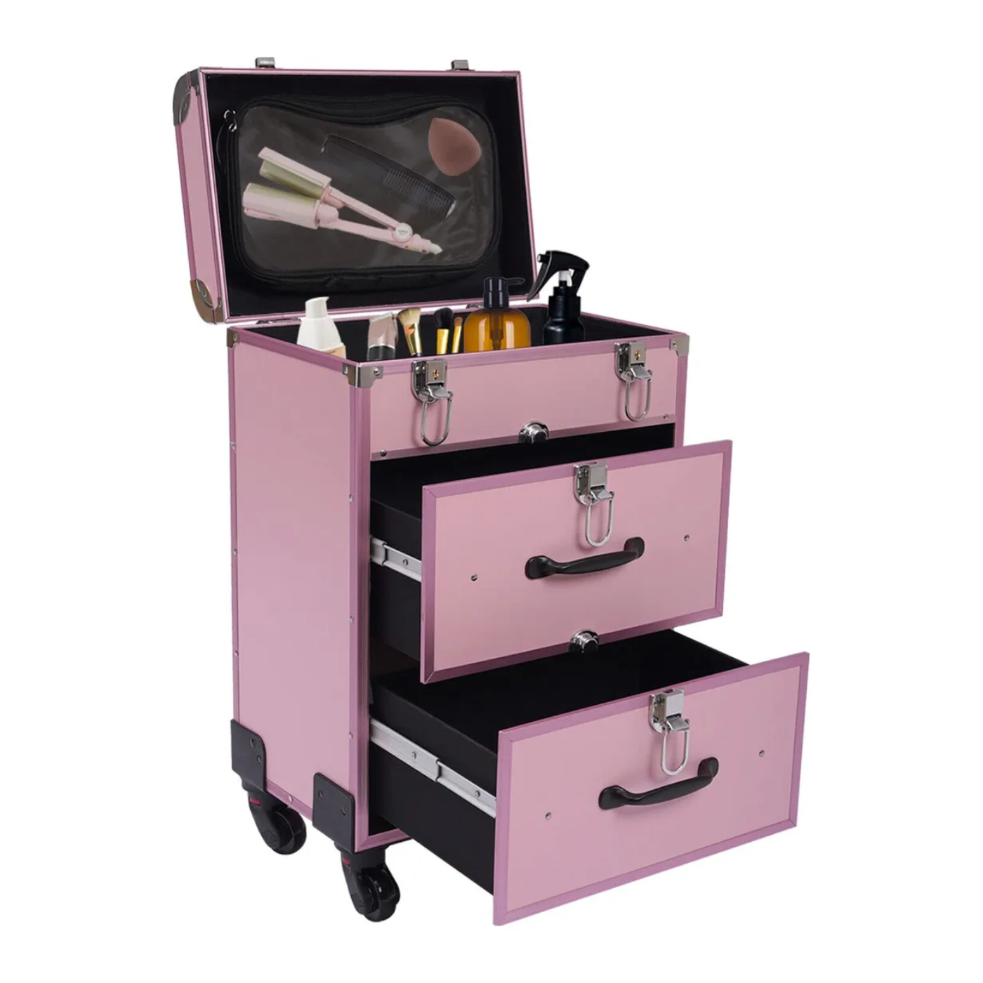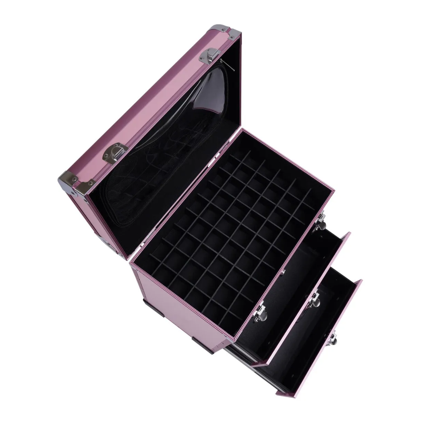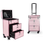 Fabricada en aluminio de alta resistencia, combina durabilidad con un acabado elegante disponible en colores rosa o negro. Su estructura espaciosa con compartimientos y cajones deslizables facilita el almacenamiento de esmaltes, brochas, herramientas, maquillaje y equipos de manicura, manteniéndolos siempre protegidos y al alcance de la mano.
