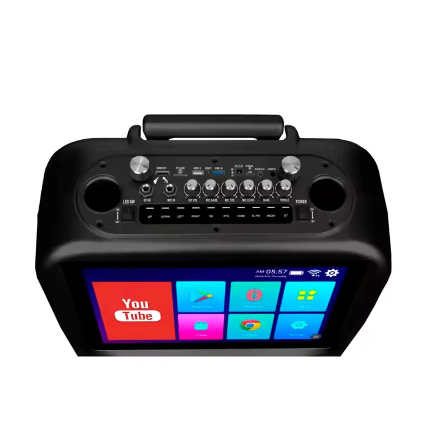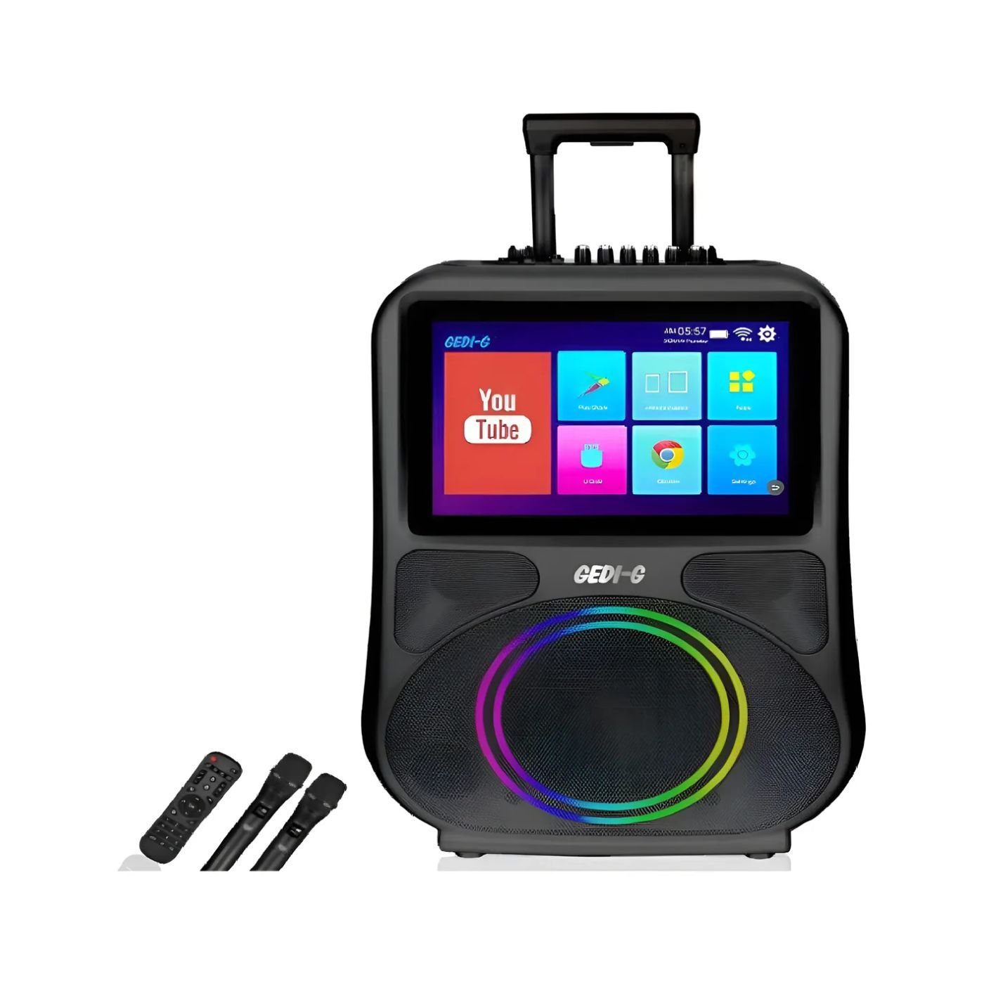 Gracias a su pantalla integrada con reproducción de video y visualización de información, puedes disfrutar de contenidos desde YouTube o archivos multimedia, elevando tus momentos de diversión a otro nivel. Además, incluye dos micrófonos para cantar, animar o presentar, lo que lo convierte en el aliado perfecto para cualquier evento.