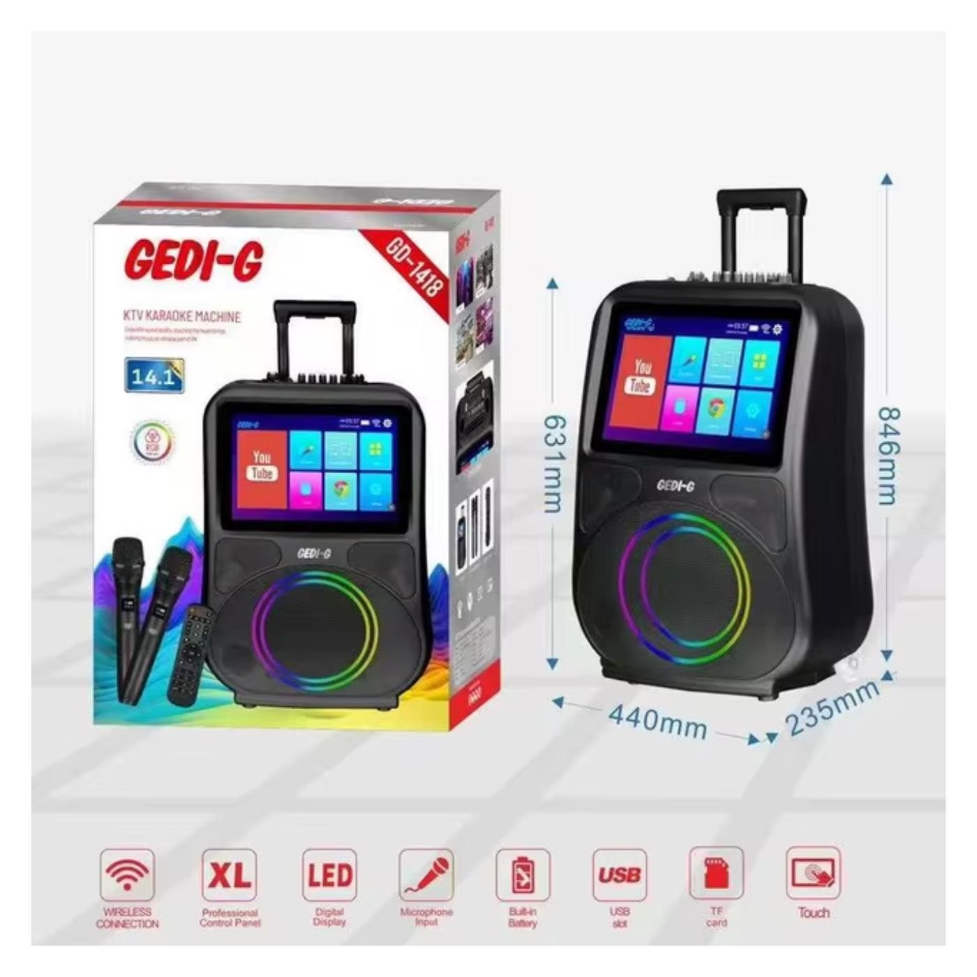 El Parlante Gedi-G 8” GD-1418 redefine la experiencia de audio al combinar potencia, tecnología y versatilidad en un diseño moderno con pantalla incorporada. Ideal para fiestas, reuniones familiares o sesiones de karaoke, ofrece una potencia de salida entre 50 y 100 W con un sonido nítido, equilibrado y lleno de energía.