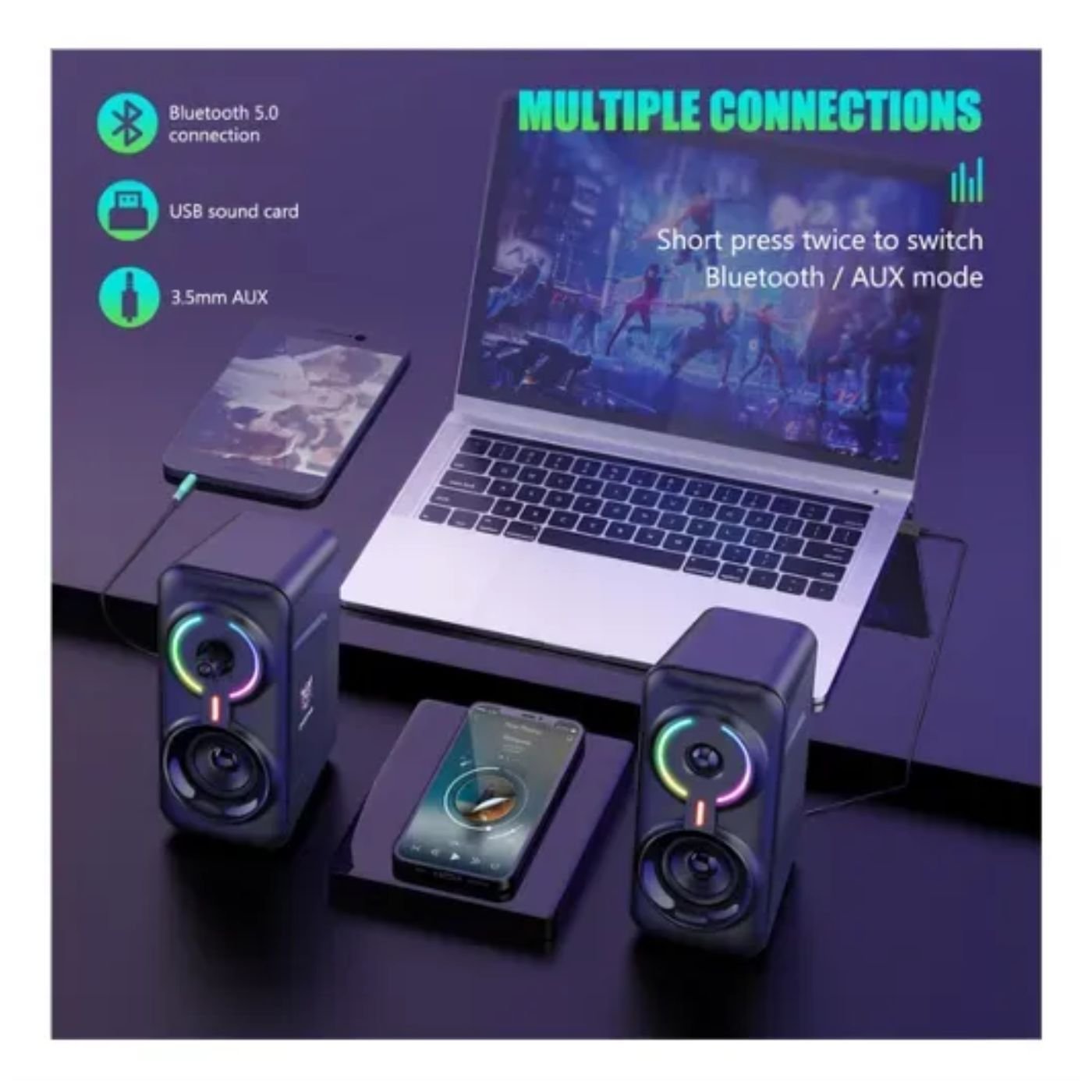 Compatible con Bluetooth 5.0, USB y entrada de 3.5 mm, lo que asegura que puedas usarlo con una amplia gama de dispositivos, desde computadoras hasta teléfonos y consolas.