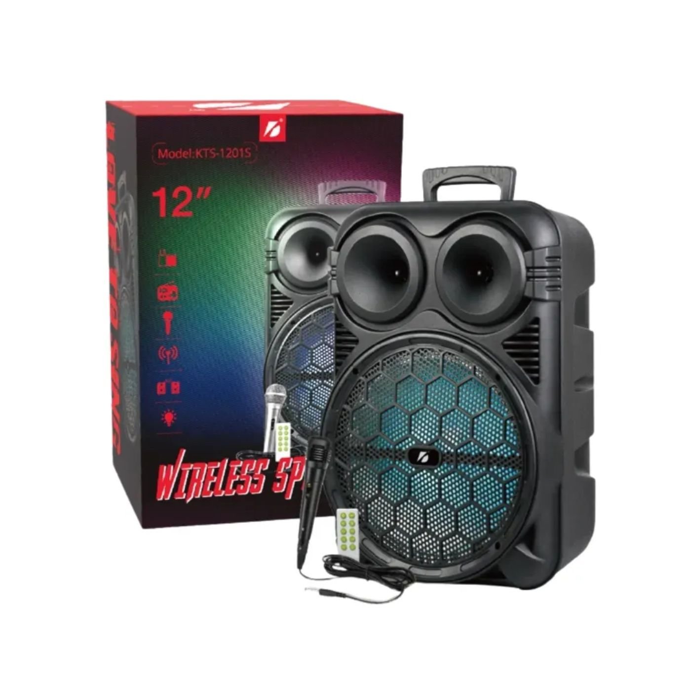 El Parlante Portátil KTS-1201S es la solución perfecta para quienes buscan potencia, iluminación llamativa y funciones completas en un solo equipo. Con su woofer de 12 pulgadas, luces LED RGB y múltiples conexiones, es ideal para animar fiestas, reuniones, eventos y actividades al aire libre. Su diseño portátil con asa superior facilita su transporte, mientras que sus funciones de karaoke lo convierten en un parlante versátil para toda ocasión.