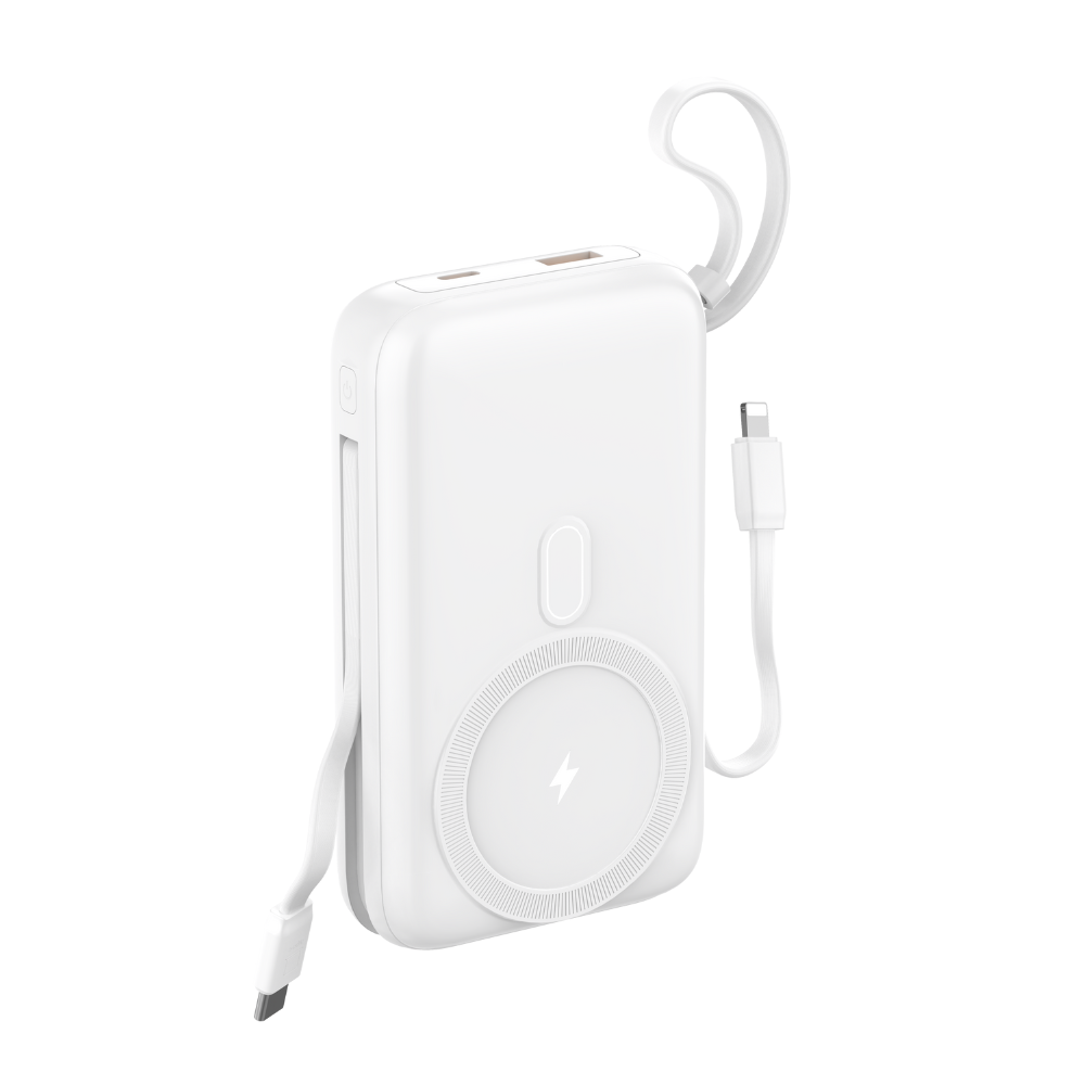 Este modelo ofrece carga inalámbrica magnética de hasta 15W y carga rápida PD de 20W por cable, brindando versatilidad y compatibilidad con una amplia gama de dispositivos. Además, incorpora dos cables integrados en material siliconado (Tipo C y Lightning), garantizando máxima comodidad en cualquier situación, sin necesidad de llevar cables adicionales.