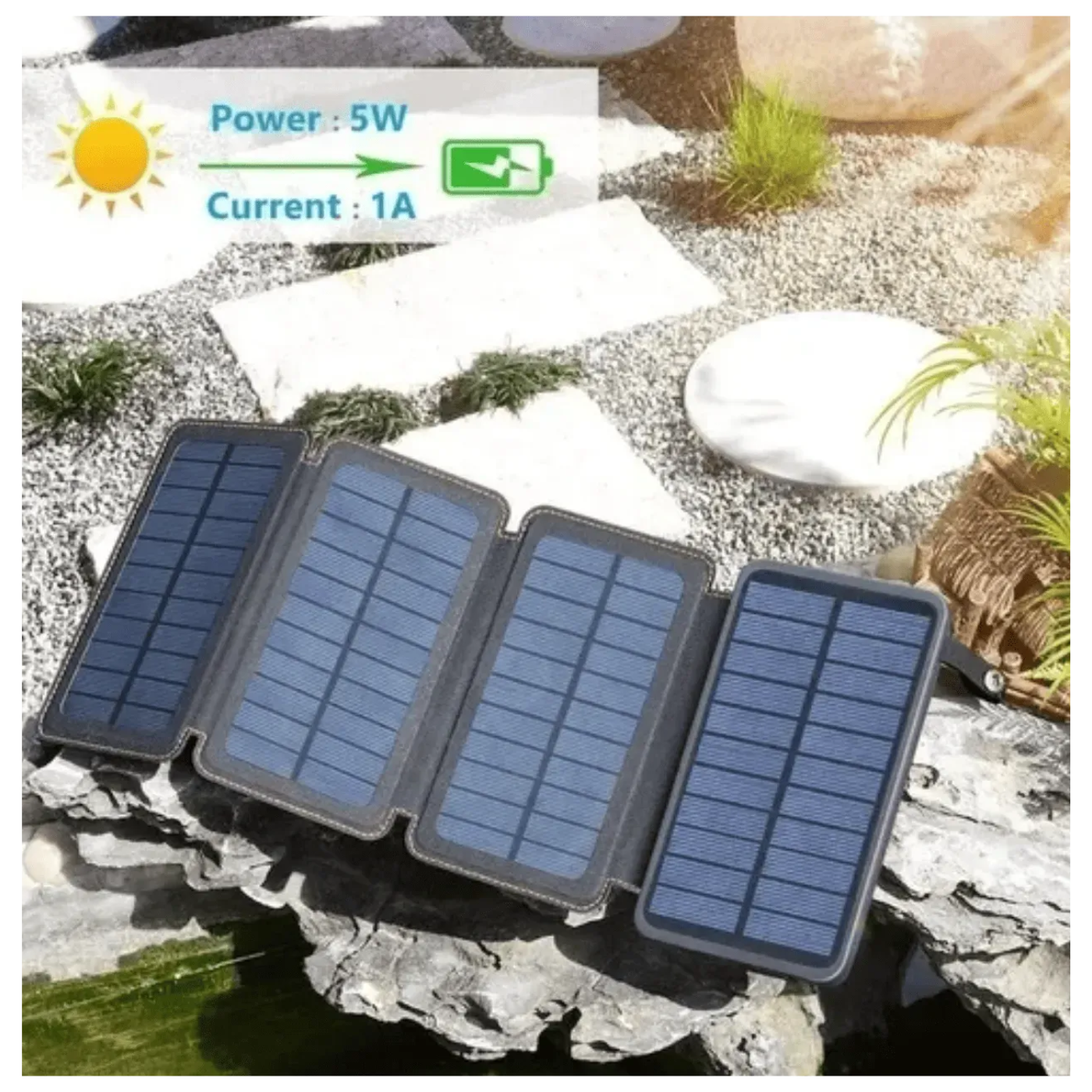 Su diseño portátil y resistente está pensado para soportar condiciones exigentes en exteriores. Los 4 paneles solares ofrecen una recarga hasta 4-5 veces más rápida que los cargadores solares convencionales, convirtiéndolo en un aliado confiable en lugares sin acceso a electricidad. Además, incorpora linterna LED de 3 modos (fija, estroboscópica y SOS), lo que lo hace útil también en situaciones de emergencia o excursiones nocturnas.