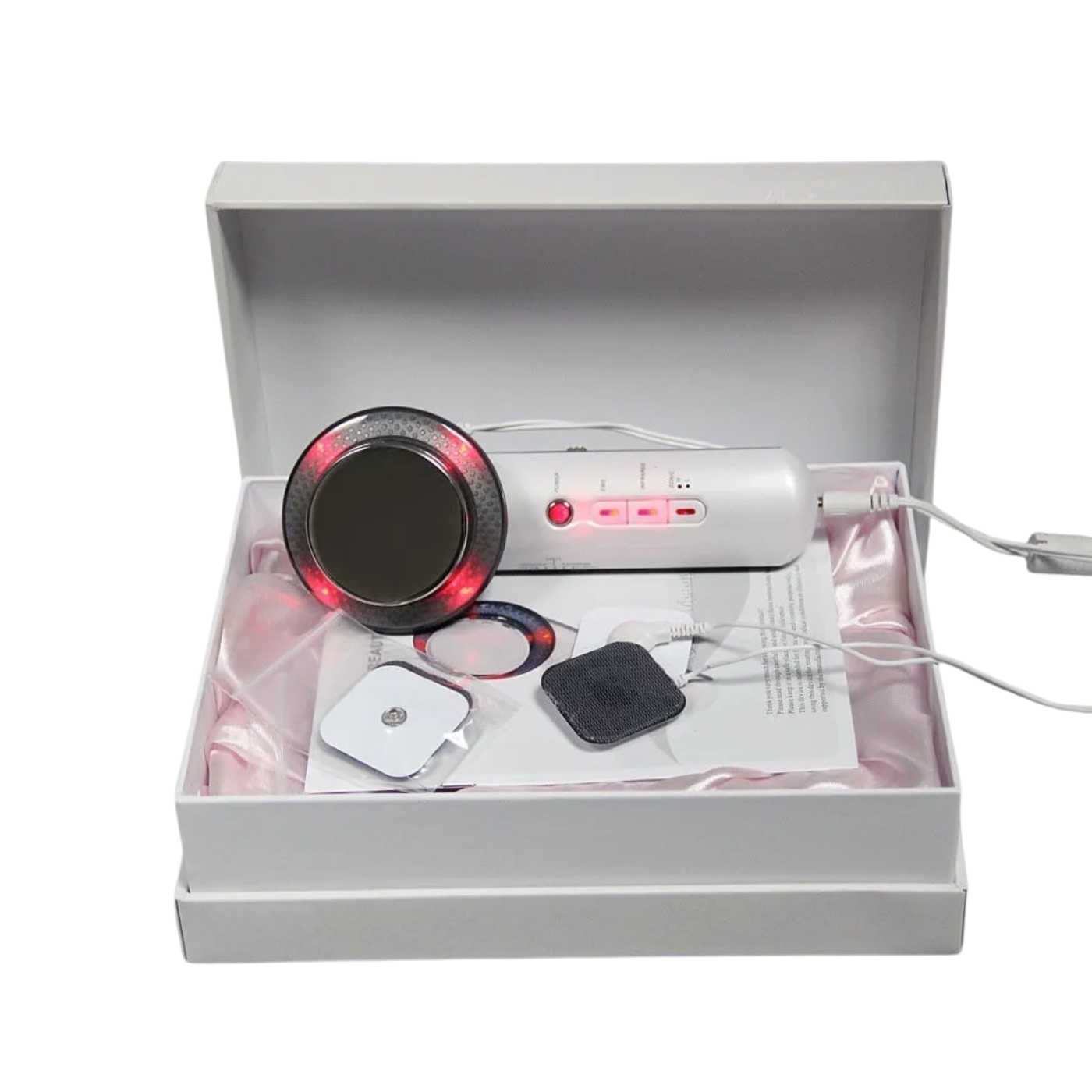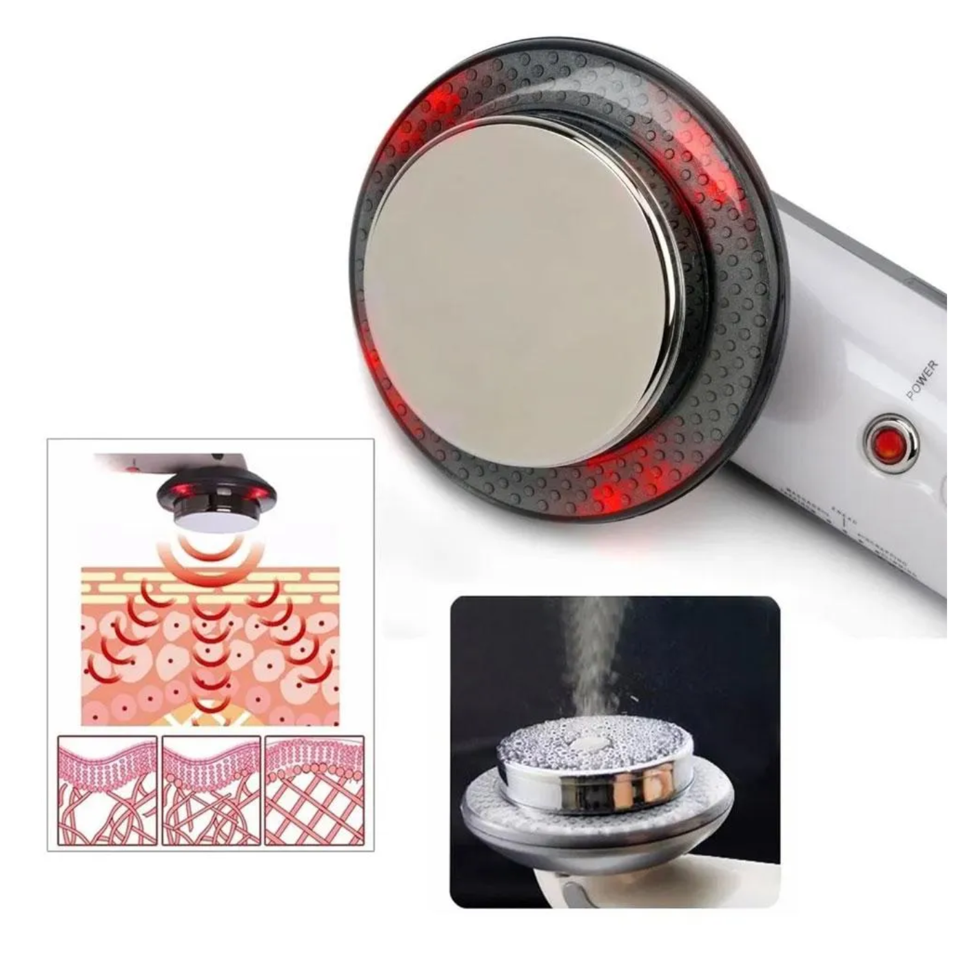 -Cavitador ultrasónico (1 MHz): genera vibraciones de alta frecuencia que actúan sobre las células grasas, estimulando la regeneración celular y favoreciendo la eliminación de residuos.