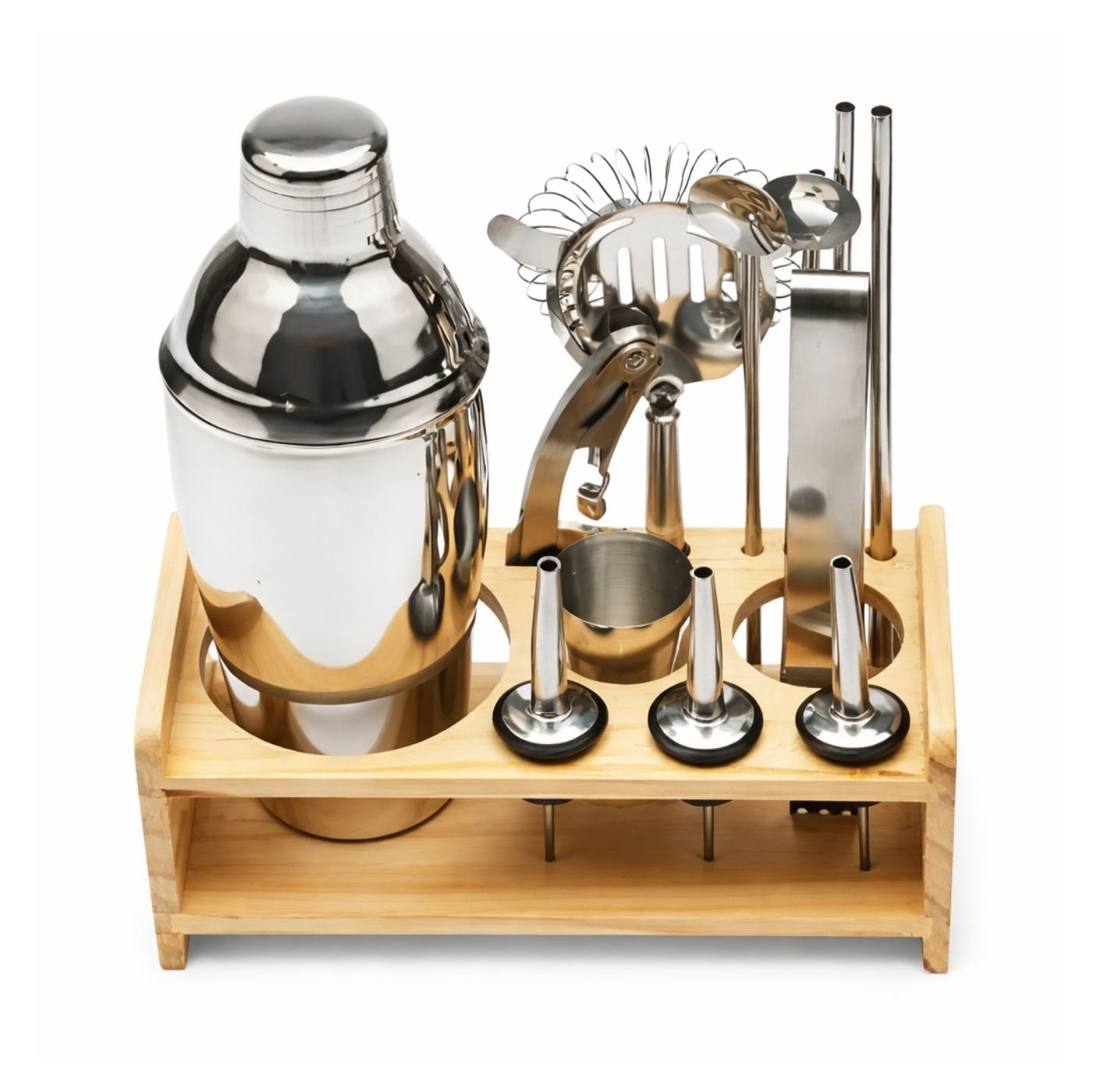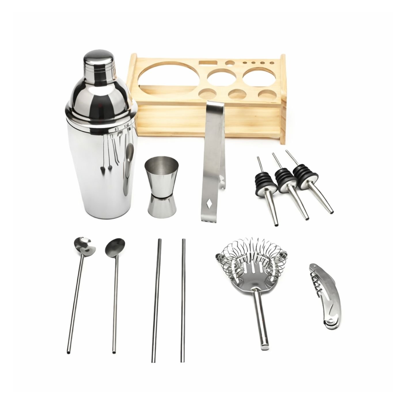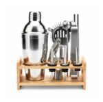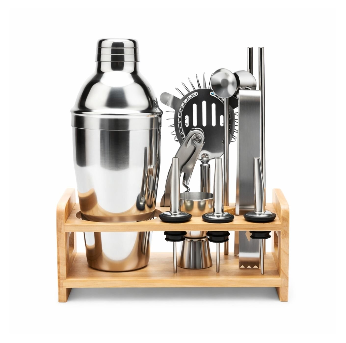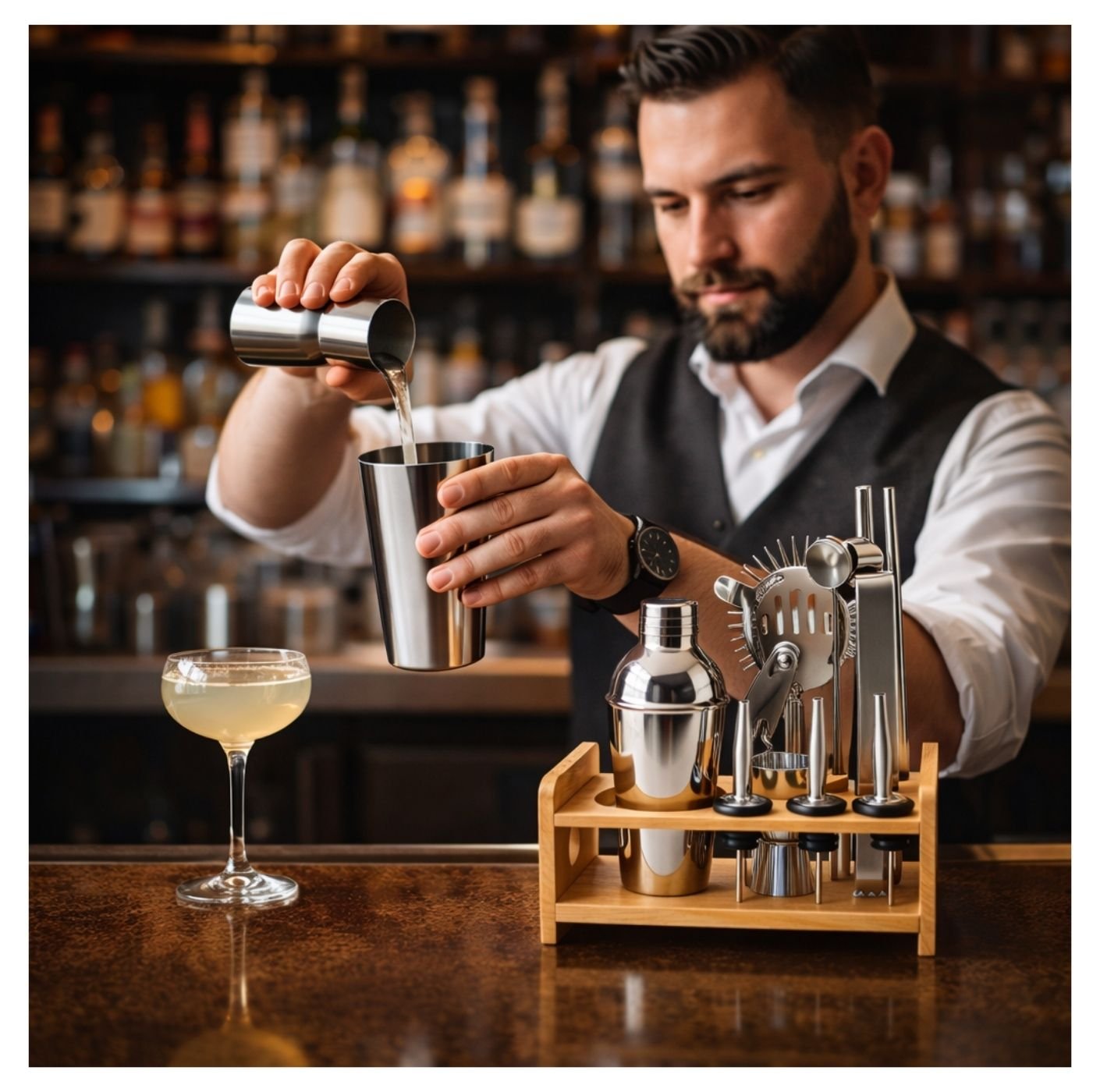 Fabricado en acero inoxidable 304 de grado alimenticio, garantiza resistencia a la corrosión, fácil limpieza y una apariencia sofisticada. Su práctico soporte organizador de bambú mantiene cada pieza en su lugar, aportando orden y estilo a tu barra.