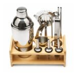 -Kit completo: incluye shaker grande, colador, jigger medidor, exprimidor, vertedores, tapones, cucharilla mezcladora, pinzas, posavasos, copas y soporte de bambú.