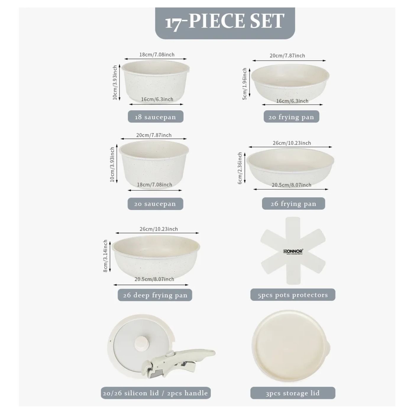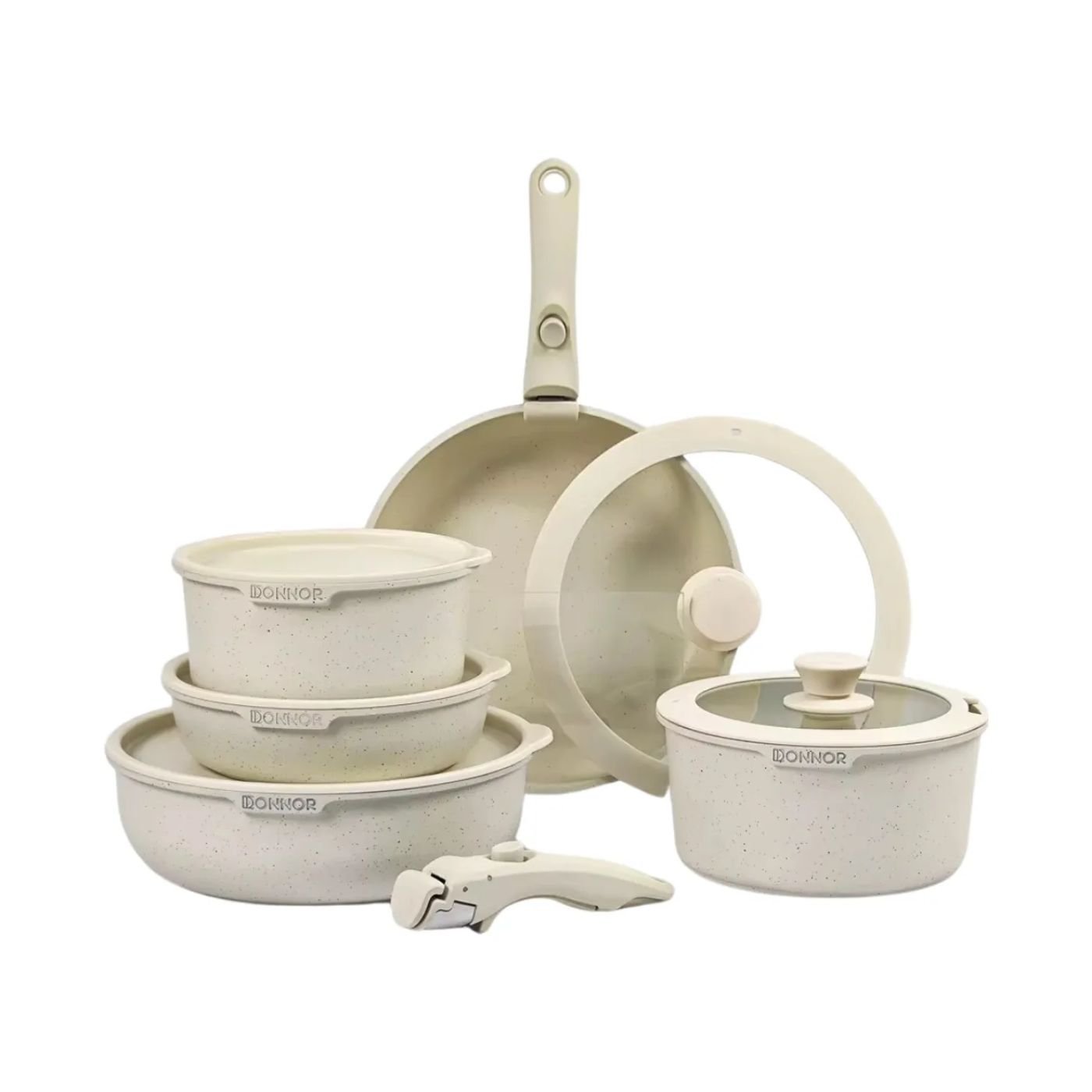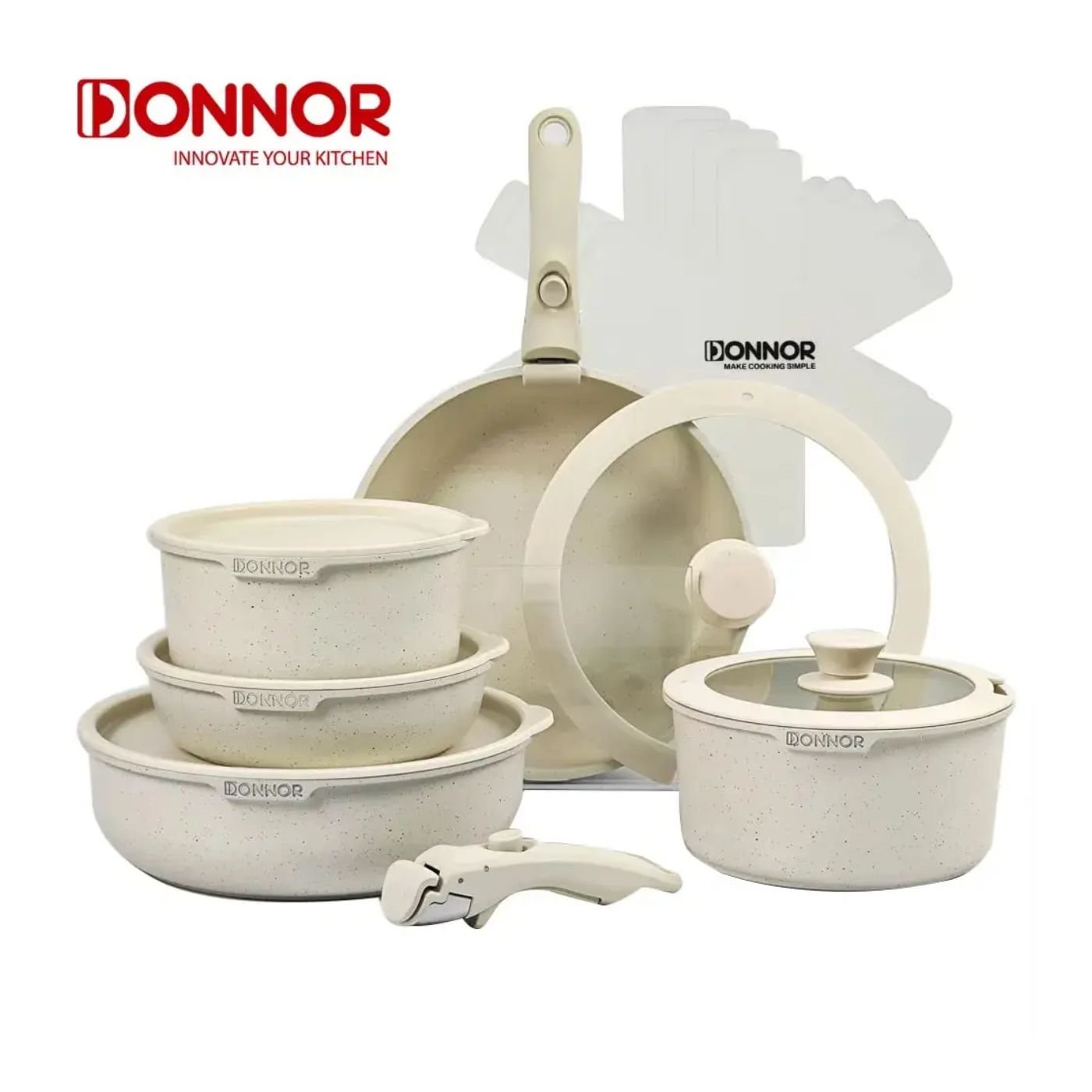 ¡Lleva tu cocina al siguiente nivel con el Juego de Ollas Donnor 17Pz! Diseñado para ofrecer practicidad, elegancia y funcionalidad, este set de lujo cuenta con un revestimiento antiadherente de granito blanco, ideal para cocinar de forma saludable y con menos grasa. Su sistema de mangos extraíbles te permite ahorrar espacio, facilitar el almacenamiento y cocinar con total comodidad.