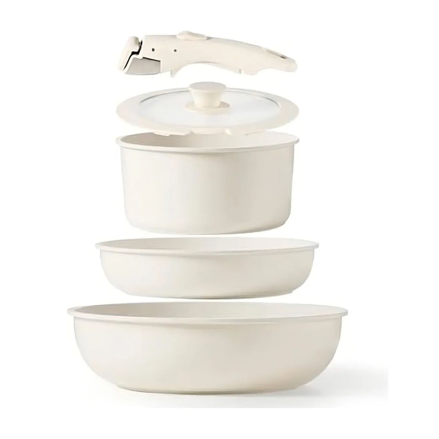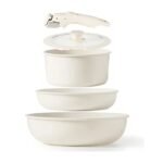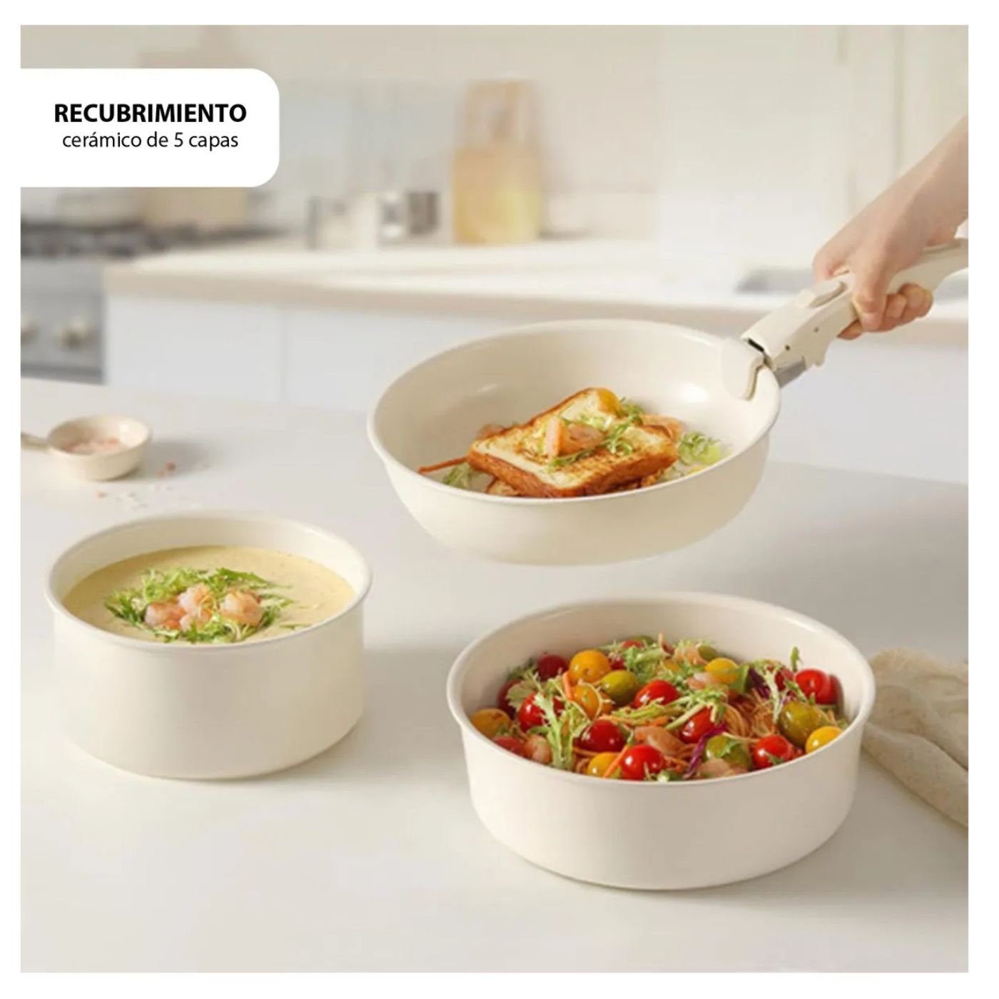 Fabricado en aluminio con recubrimiento de granito antiadherente, este juego garantiza una cocción uniforme, saludable y libre de sustancias tóxicas. Su diseño apilable permite ahorrar hasta un 50% de espacio, siendo una excelente opción para hogares que valoran la organización y la elegancia en su cocina.