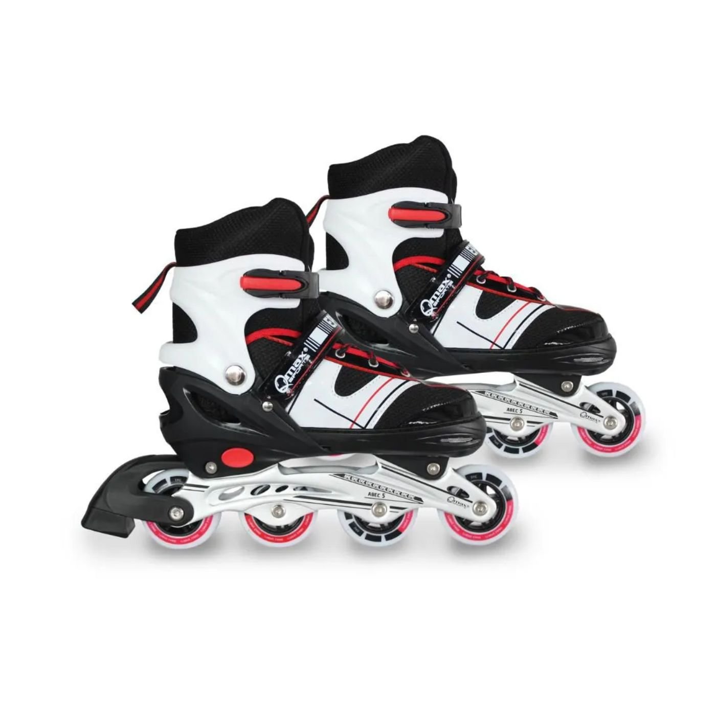 La bota acolchada, con cordón y sistema de hebillas, asegura un ajuste firme que mantiene el pie protegido en todo momento. Además, los patines son ajustables a 4 tallas (36 a 39), permitiendo que acompañen el crecimiento del niño y prolongando su tiempo de uso. Este set incluye casco, protecciones, conos y una bolsa de transporte, ofreciendo un equipo completo para entrenar y divertirse de forma segura.