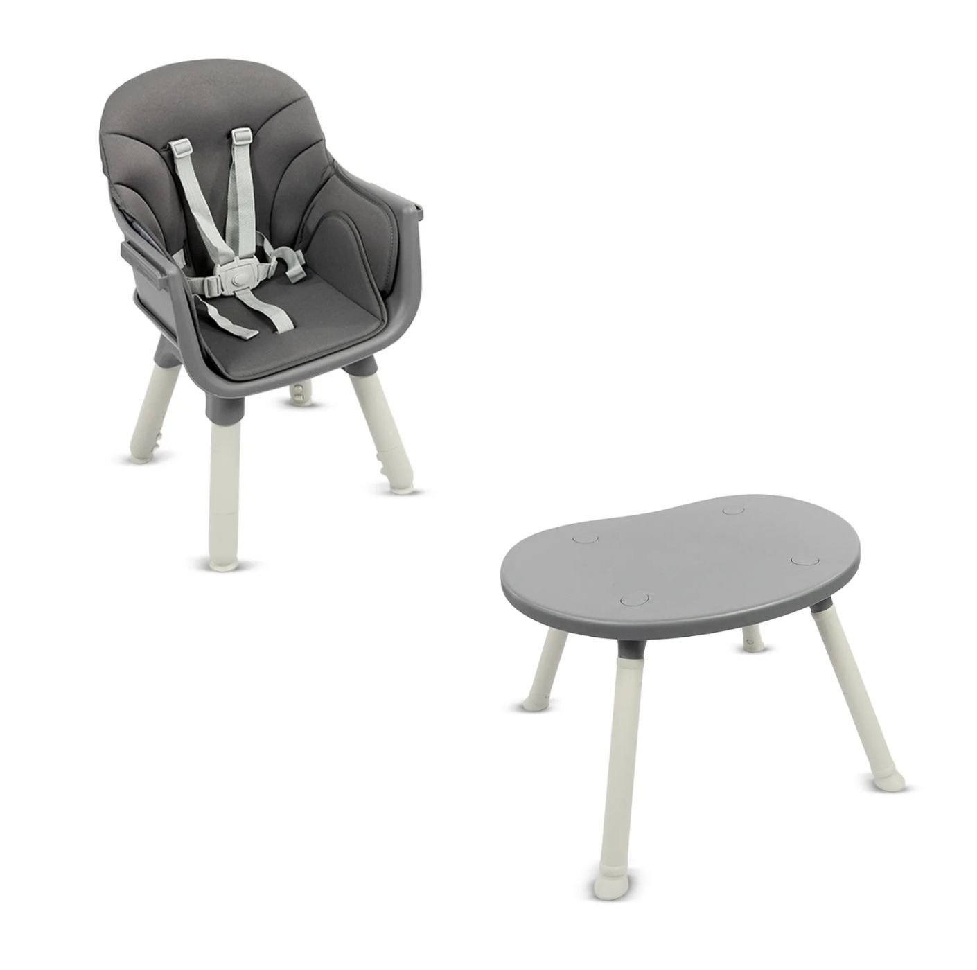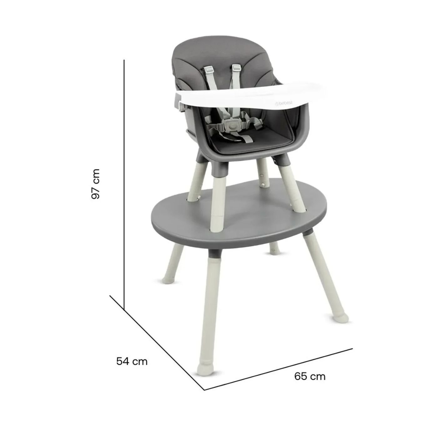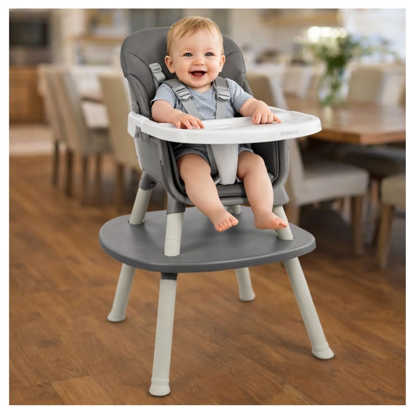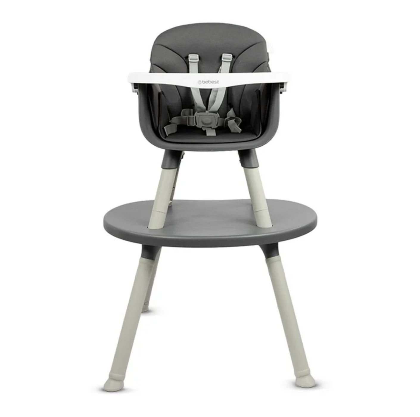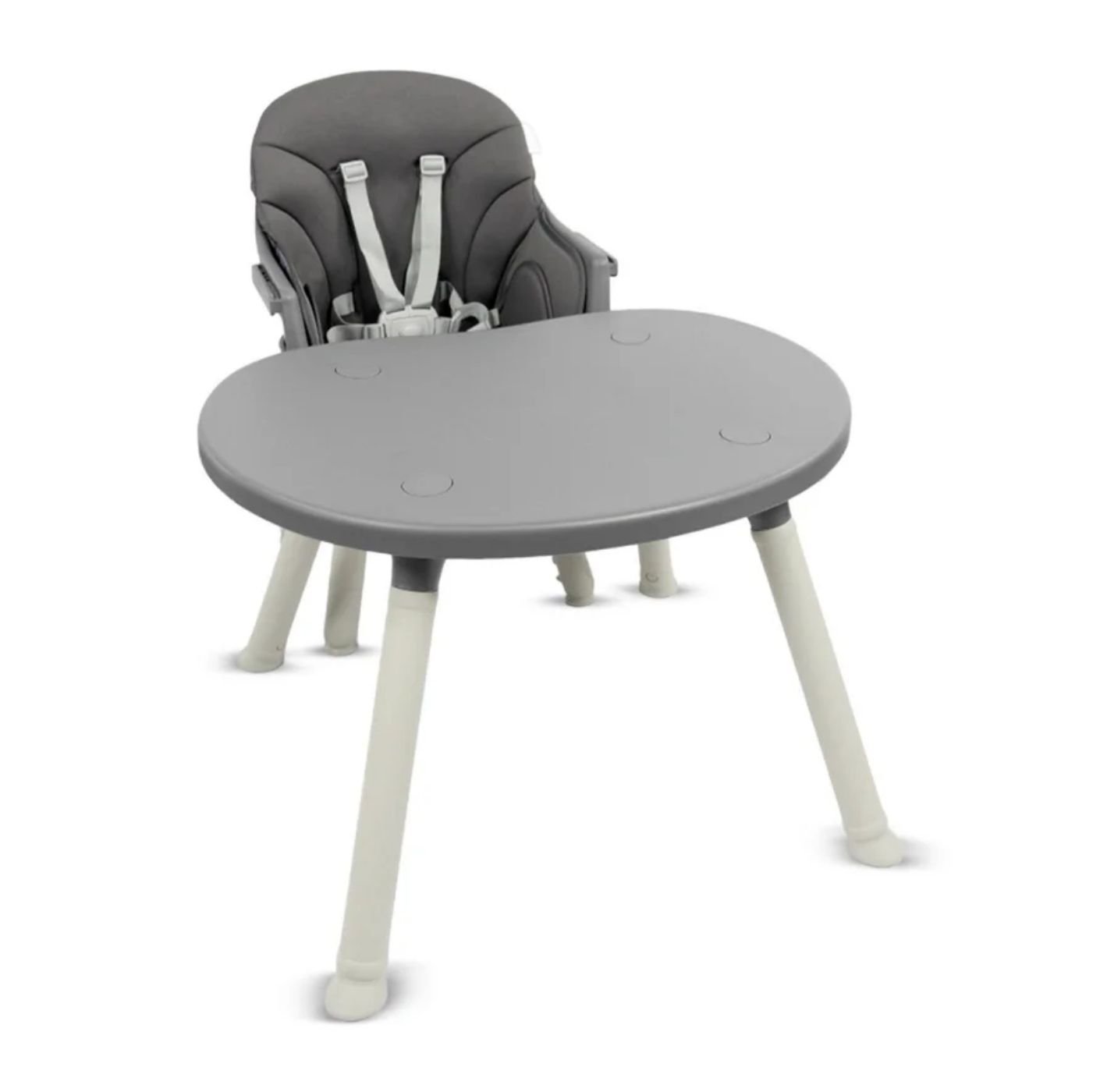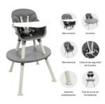 Fabricada en plástico de alta resistencia, esta silla ofrece asiento acolchado, bandeja frontal removible y cinturón de seguridad de 5 puntos, garantizando comodidad y protección en cada uso. Su diseño permite un ensamble rápido, es fácil de limpiar y brinda estabilidad para el uso diario. Su color gris moderno y funcional la convierte en una excelente opción para cualquier espacio del hogar.