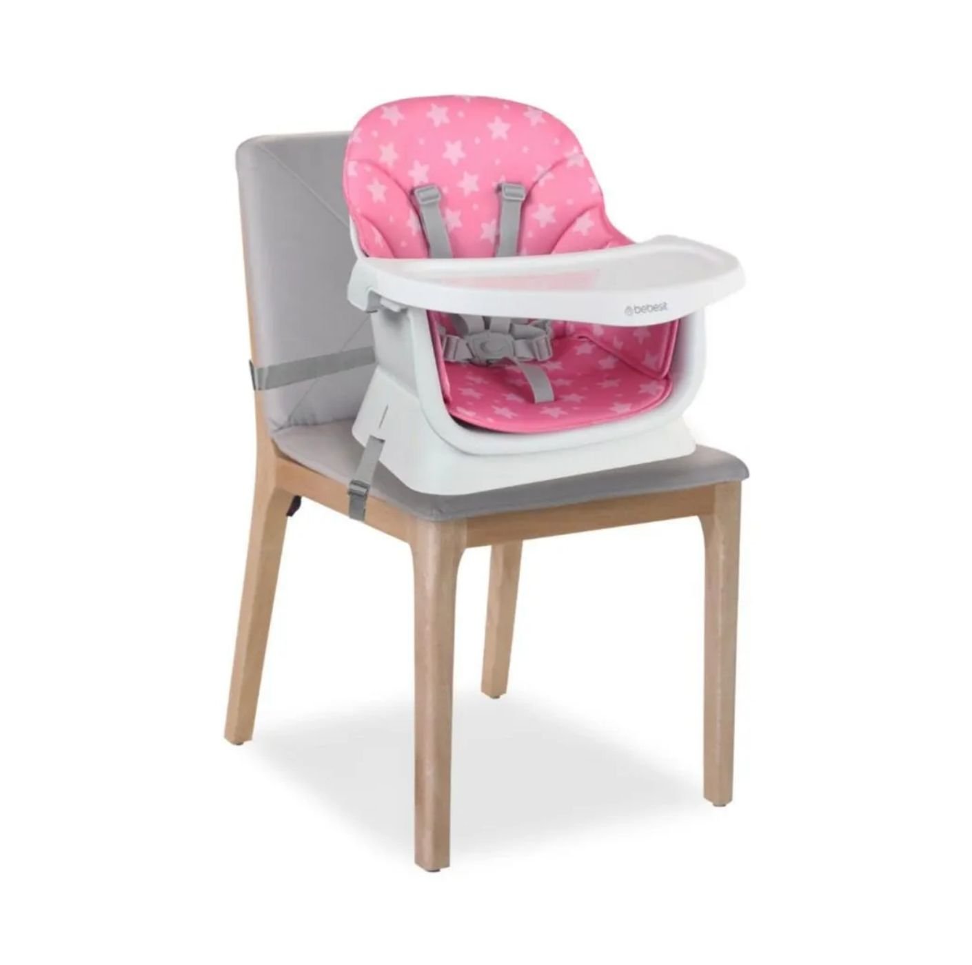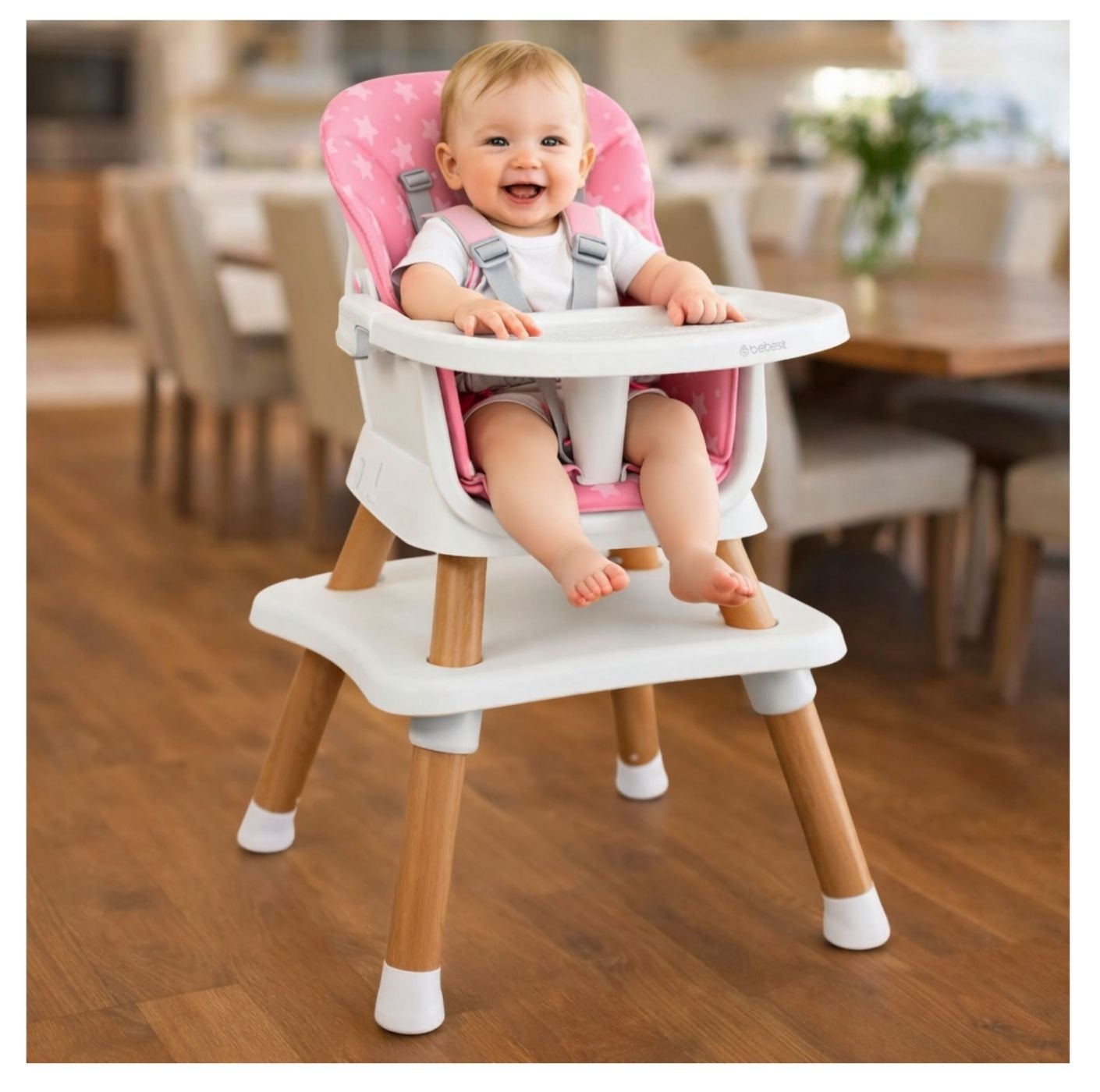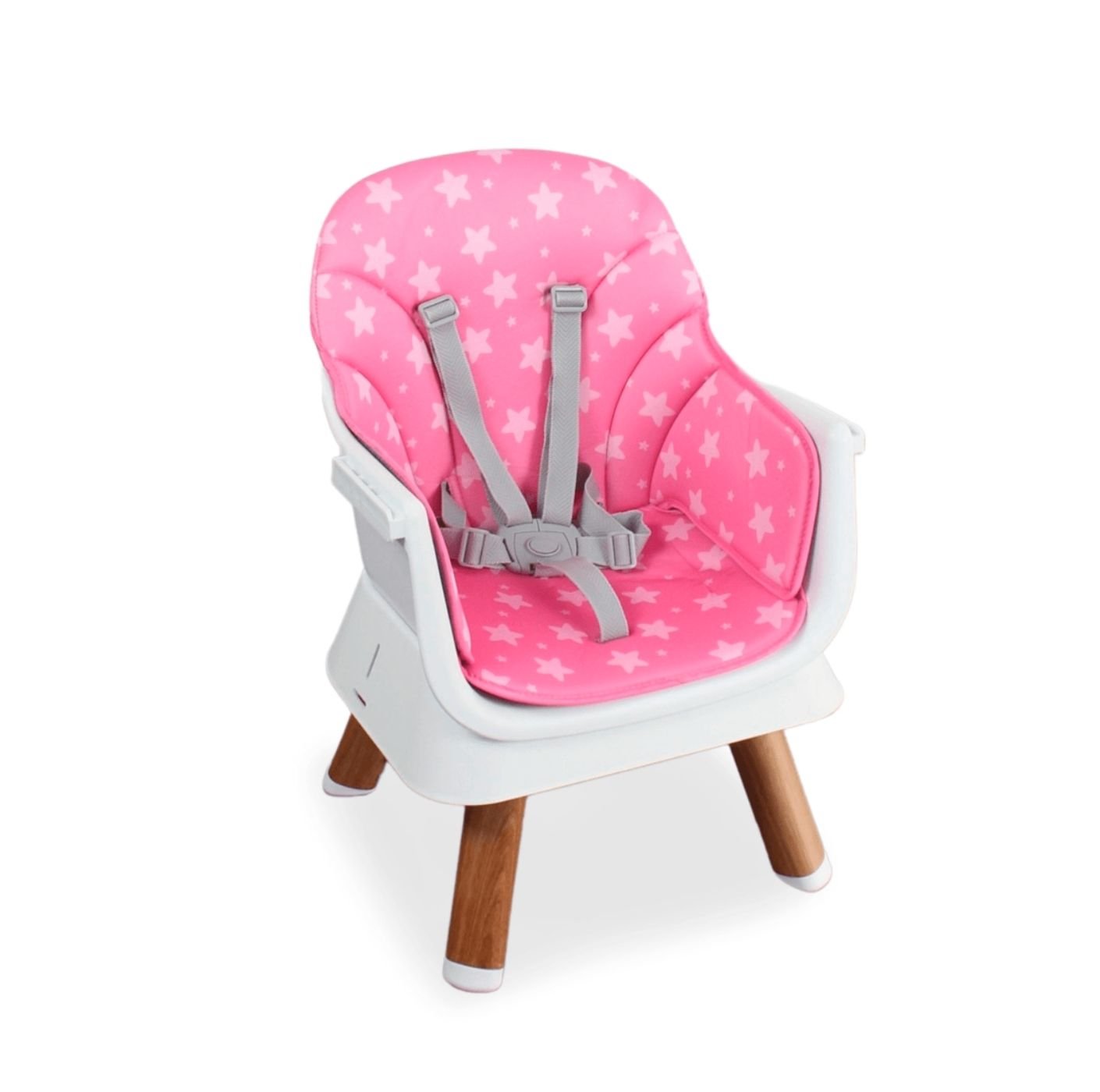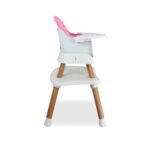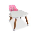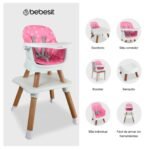 Fabricada en plástico de alta resistencia, esta silla incorpora asiento acolchado, bandeja principal removible con 3 posiciones y cinturón de seguridad de 5 puntos, garantizando confort y protección en cada uso. Sus soportes antideslizantes en las patas aportan mayor estabilidad, mientras que su armado sin herramientas facilita su uso diario. Su delicado color rosado premium la convierte en una opción funcional, segura y con un diseño encantador para el hogar.