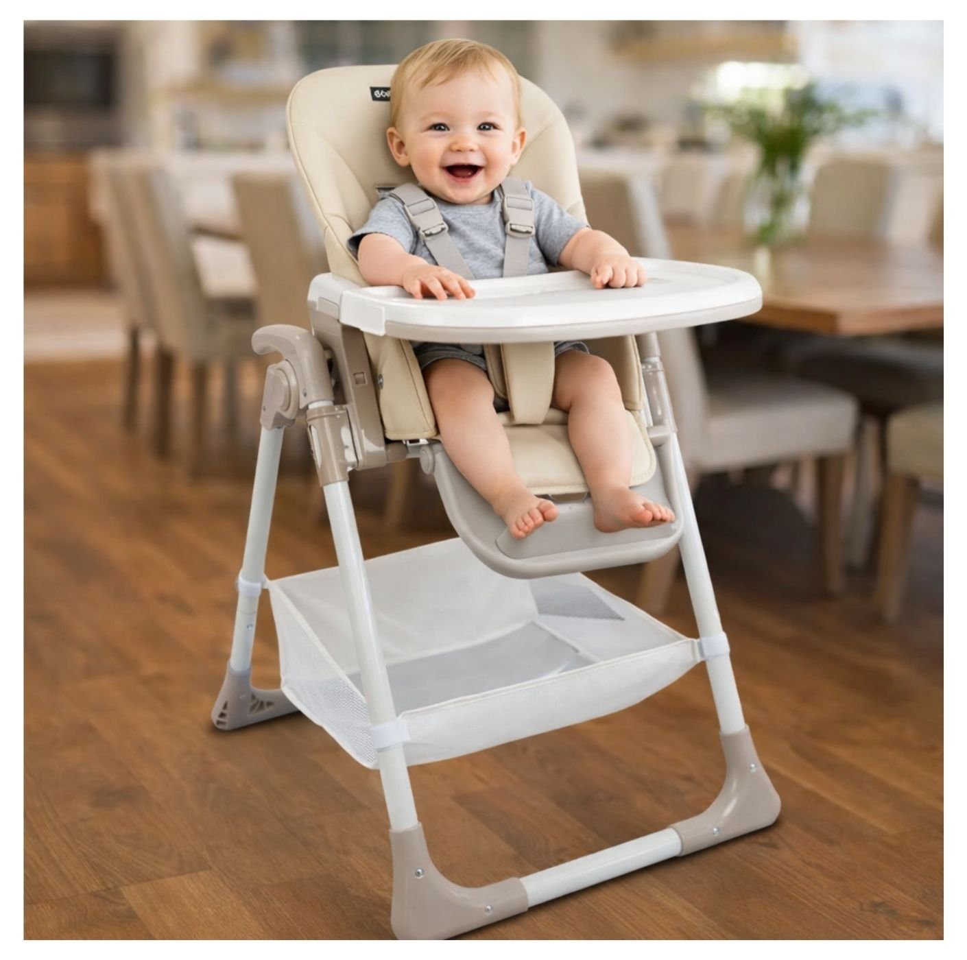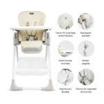 Cuenta con 6 posiciones de altura, 5 posiciones de reclinado y una doble bandeja removible ajustable en profundidad a 3 niveles, facilitando la interacción con el bebé y la limpieza diaria. Su asiento incorpora tela acolchada removible en PVC, resistente y fácil de lavar, junto con cinturón de seguridad de 5 puntos, reposapiés ajustable y ruedas con freno que garantizan estabilidad y movilidad. Una silla funcional, segura y práctica para hacer de cada comida un momento especial.