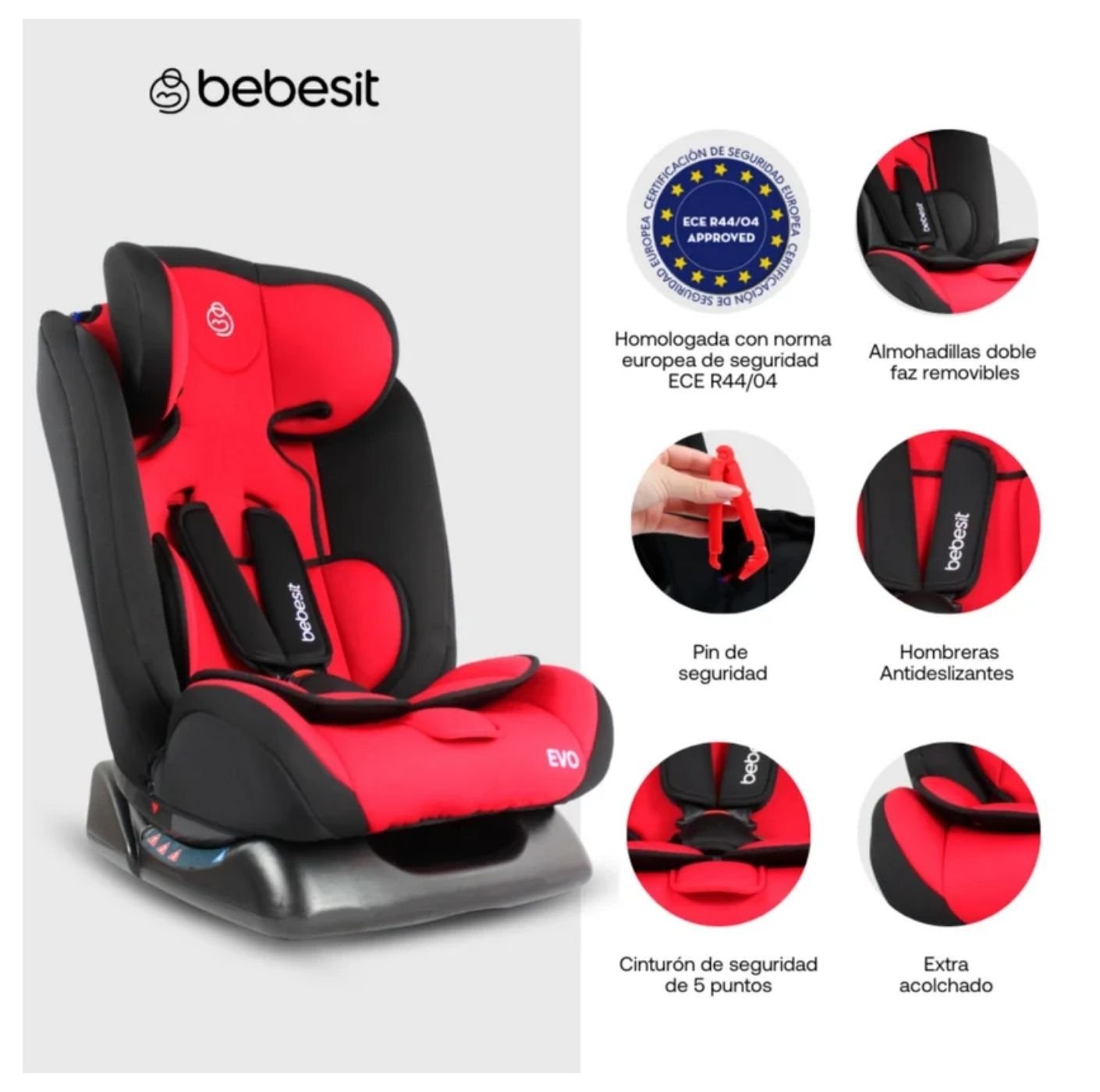 La Silla de Auto Bebé Evo Red ZY26R Bebesit es una silla multigrupo diseñada para brindar seguridad y comodidad desde recién nacido hasta 36 kg, adaptándose a cada etapa del crecimiento. Cuenta con certificación europea, 4 posiciones de reclinado y arnés de 5 puntos, ideal para un uso diario práctico y seguro.