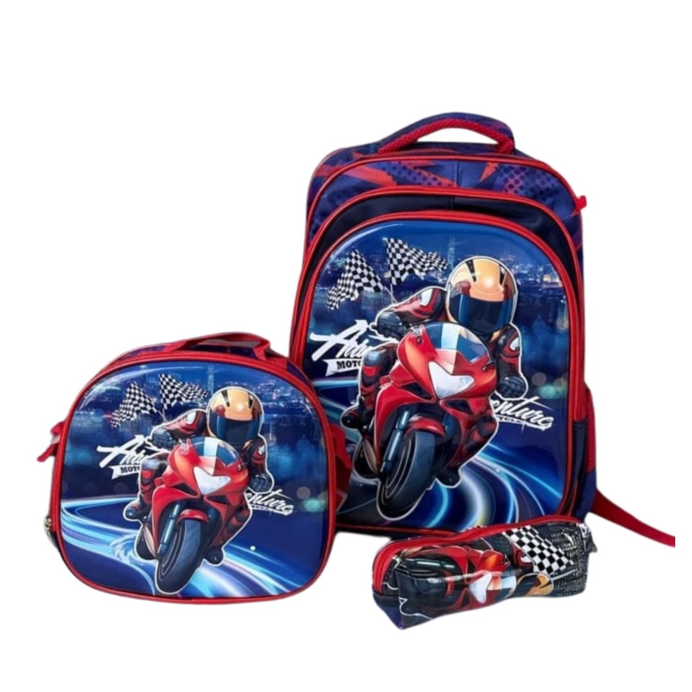 El Trío Escolar Motociclista WL-1907 BluM es un set ideal para niños amantes de la velocidad y los diseños deportivos. Incluye maleta, lonchera y cartuchera a juego, todos con un llamativo diseño de motociclista que aporta estilo y personalidad al día a día escolar.